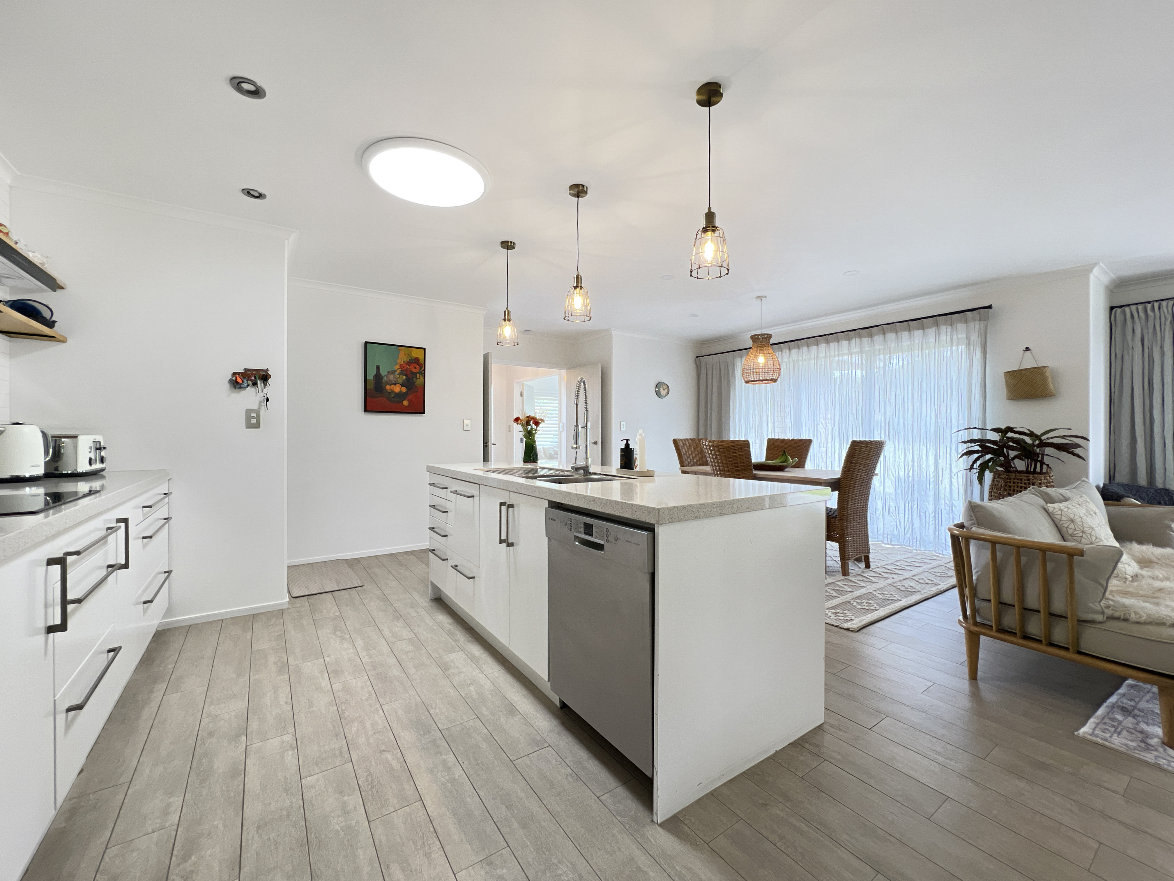 Discover this huge two-level home offering stunning elevated rural and park-like views. The large open-plan living area features native timber floors and includes a lounge, dining space, and kitchen with a breakfast bar and scullery. Bi-folding windows allow for uninterrupted east-facing views with access onto a sunny and spacious deck, providing excellent indoor-outdoor flow ideal for entertaining and enjoying the peaceful surroundings. First level comprises of two bedrooms, a dedicated office space, and a family bathroom with a separate toilet. The lower level is self-contained, featuring three additional bedrooms, a second lounge, kitchenette, and bathroom - perfect for extended family or guest accommodation. Heating is efficiently managed with a wood burner, ensuring comfort throughout the home. • Six bedrooms • Two bathrooms • Two living areas • Internal garaging • Massive shed storage The property includes a concreted driveway leading to double internal garage parking, complemented by a large three-bay shed with a workshop for ample storage and workspace. Set on a manageable 5,000m2 section (more or less), the grounds are beautifully established and ideal for outdoor family activities. Located only 8 km from Opotiki, this home offers both space and convenience for a relaxed rural lifestyle. This property is priced to sell! Viewings by appointment only.