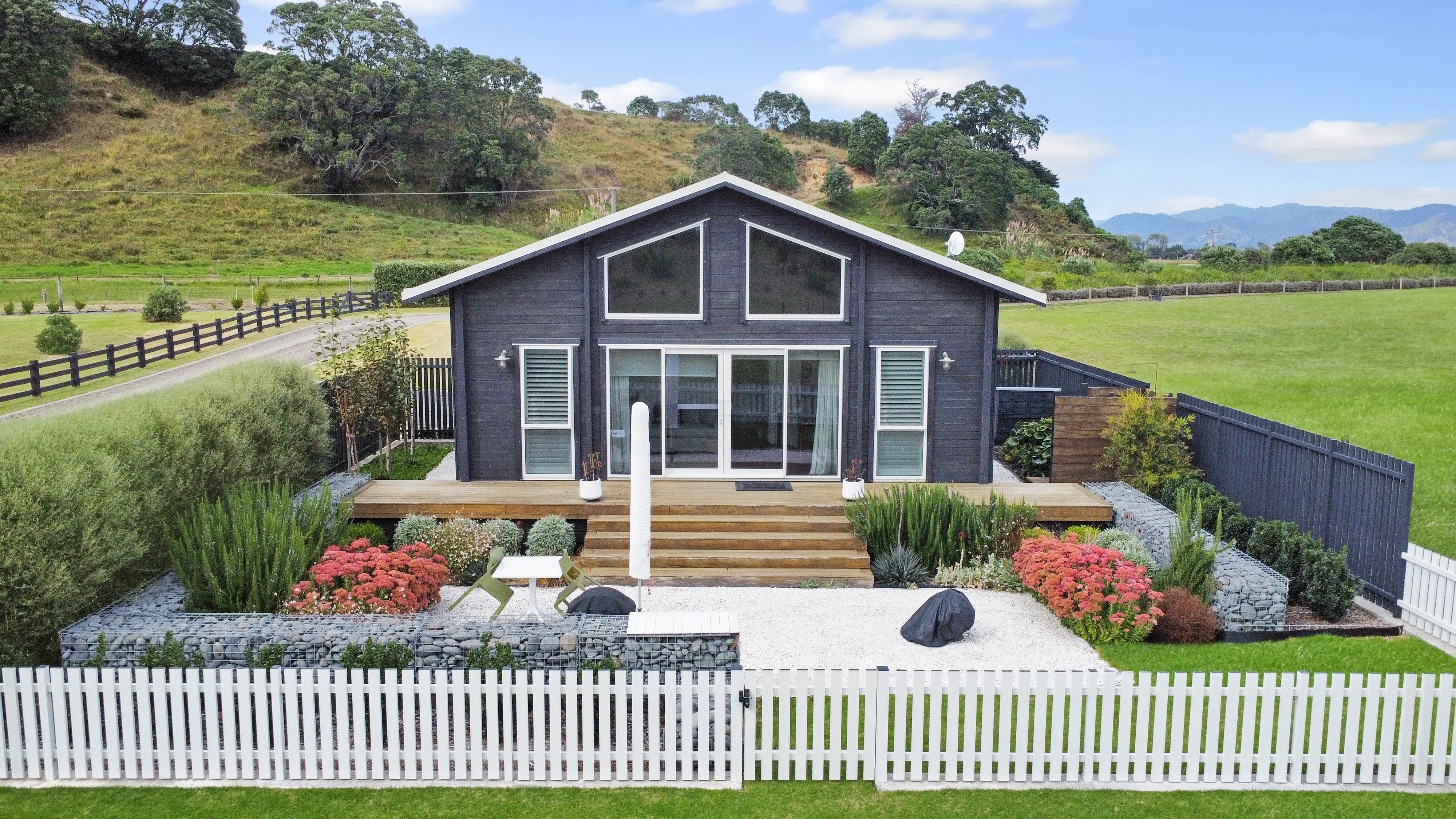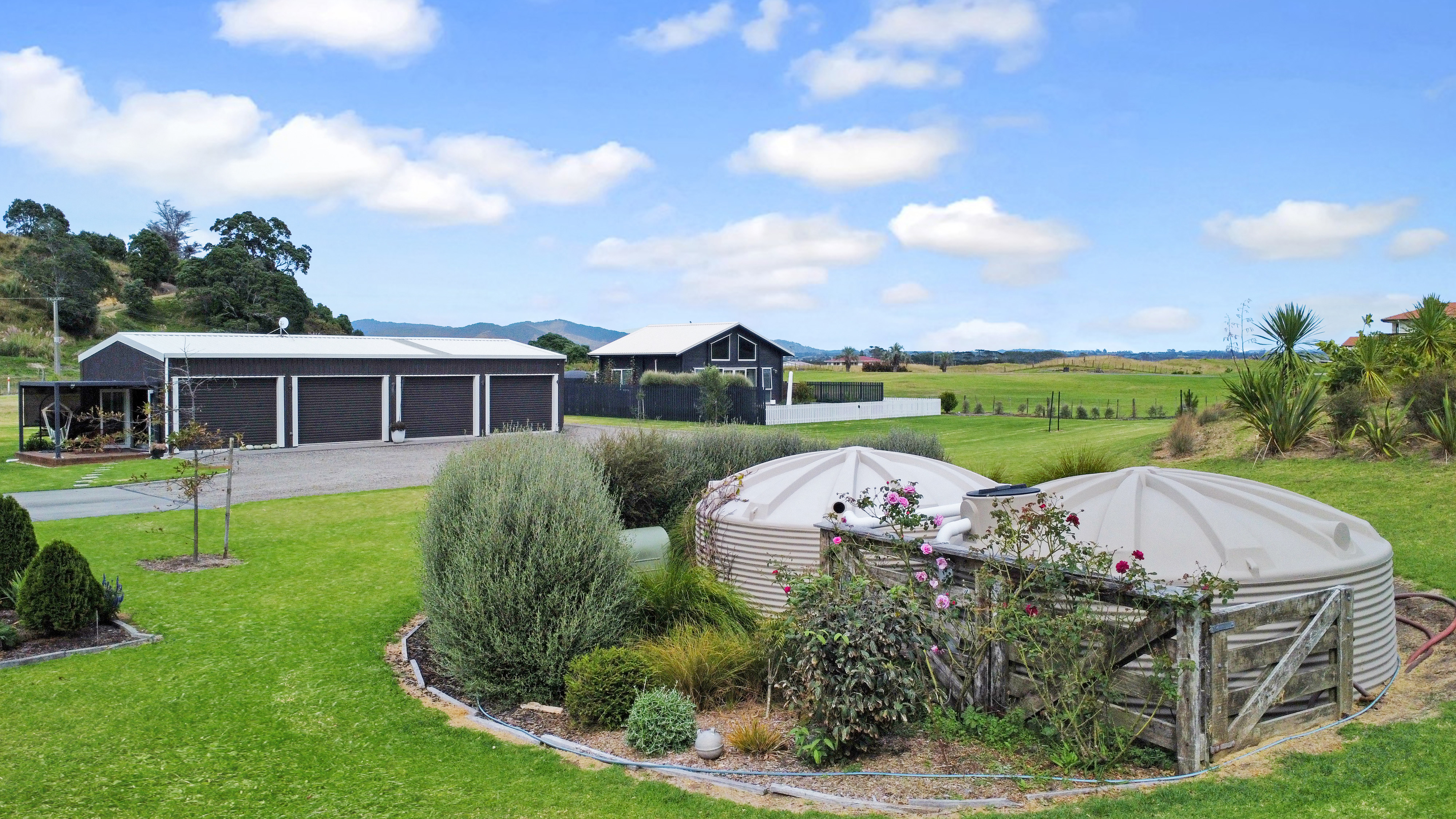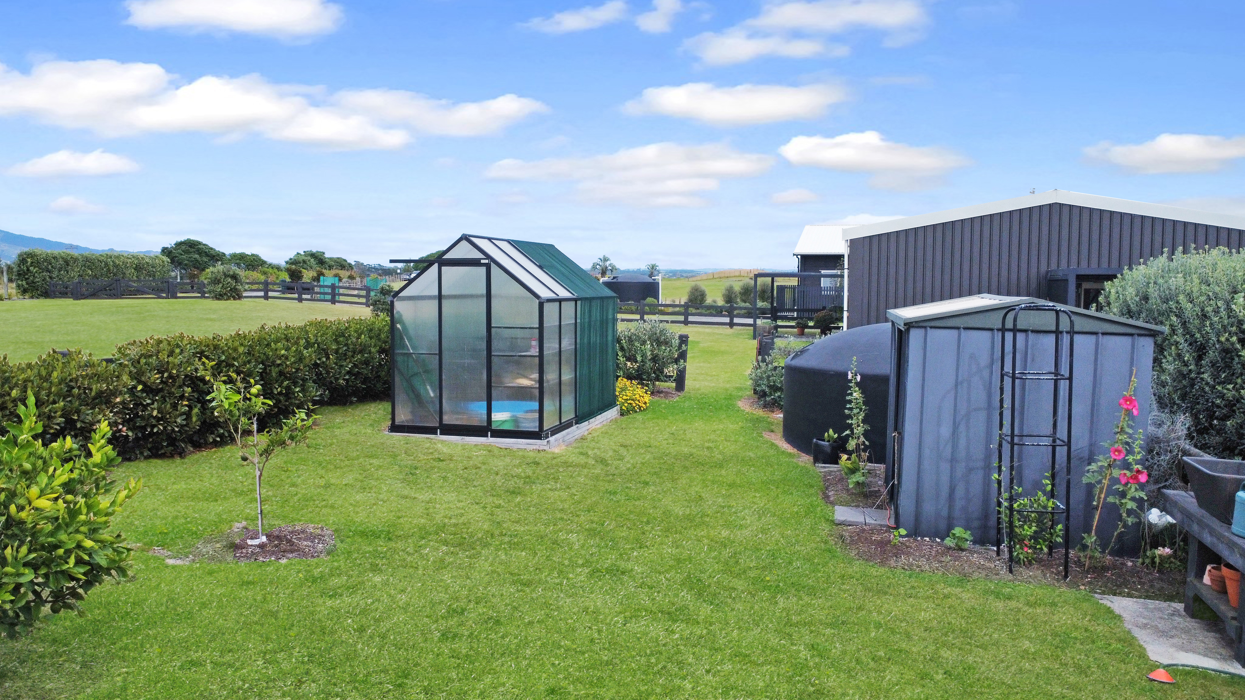Fixed floor coverings, Light fittings, Blinds, Drapes, Rangehood, Dishwasher, Smoke detector(s) x 4, Auto Garage Door Opener x1, Bath, Clothesline, Double Wall Oven - Electric, Extractor Fan x2, Garden Shed, Water Reticulation System, Letterbox, Mirrors, Satellite Dish, Security Lighting, Water Tanks - 3 x 25,000 litre, 1 x 10,000 litre, Outdoor Shower (cold) x2, Bin Storage, Wood Storage, Trough by office, Laundry Tub + Bench (gardening), Induction Hob Cottage Chattels: Oven combined Microwave Oven, Induction Hob, Dishwasher drawer x 1, Heat pump x 1 and x 1 remote, Ceiling fans x 2, Ventilation fan in laundry (vented for dryer), Extractor fan (bathroom), Underfloor heating (bathroom), Heated towel rail x 1, Smoke detectors x 2, Fixed shelving/cabinets, Dining table (fixed), Gas califont hot water, Security lighting, Bin storage (Excluded Chattels: Glasshouse, Security Cameras, Outdoor Ornaments and Pots)
