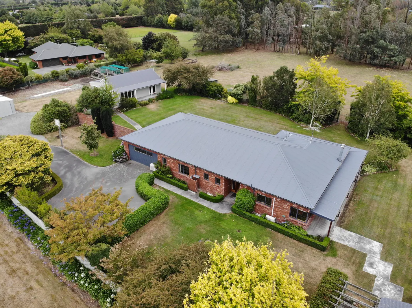 The nuns have used this well planted private landscape and large family home as a retreat centre. Alongside the recycled brick 250m2 4 bedroom home is a modern spacious 2 bedroom flat (ideal for a dependent relation). The home boasts timber reveals and finishing throughout, double glazing, heatpumps and woodburner. Both large lounge and kitchen/dining area open to an extensive verandah to sit in the shade and let time flow by. The landscape is a "treat". Enter through wrought iron gates to the sealed drive and parking spaces. Trimmed boxed hedging lines the pathway and gardens. Excellent varietal shelter surrounds the large lawn. Extensive sheltered outdoor seating and dining courtyard. Other amenities include double garage/workshop, raised gardens, fruit trees- it has it all. Ready to move into with early possession available.