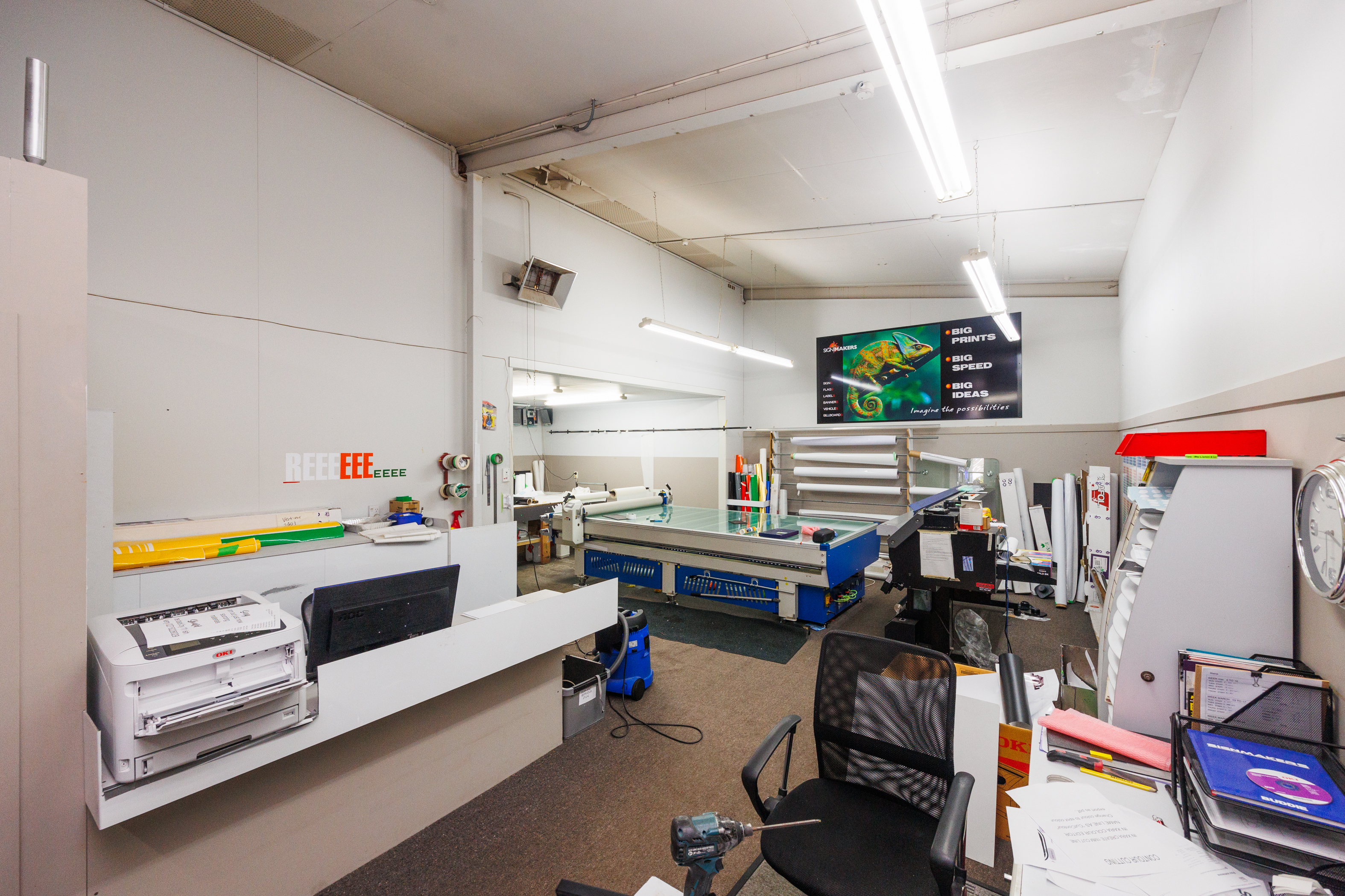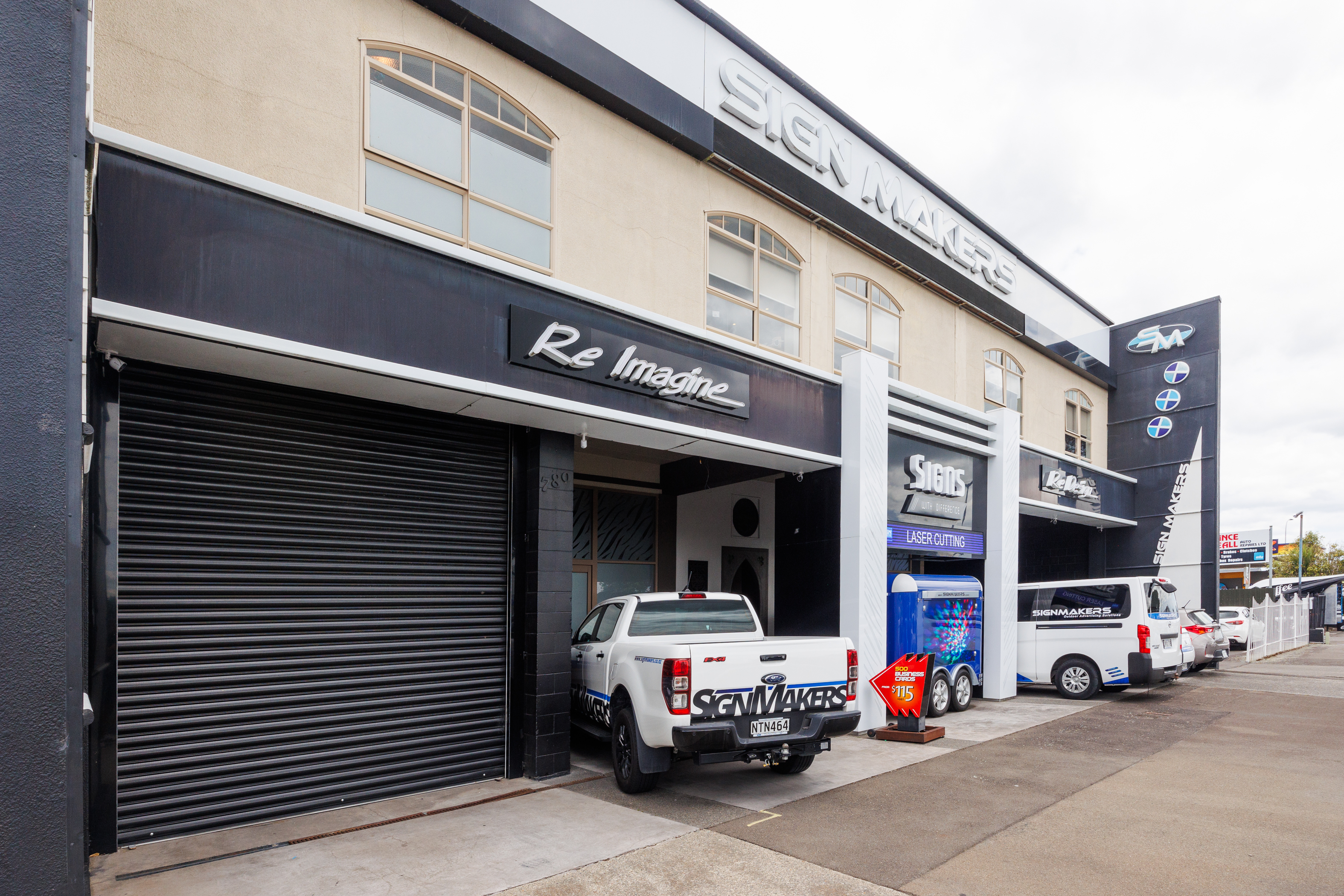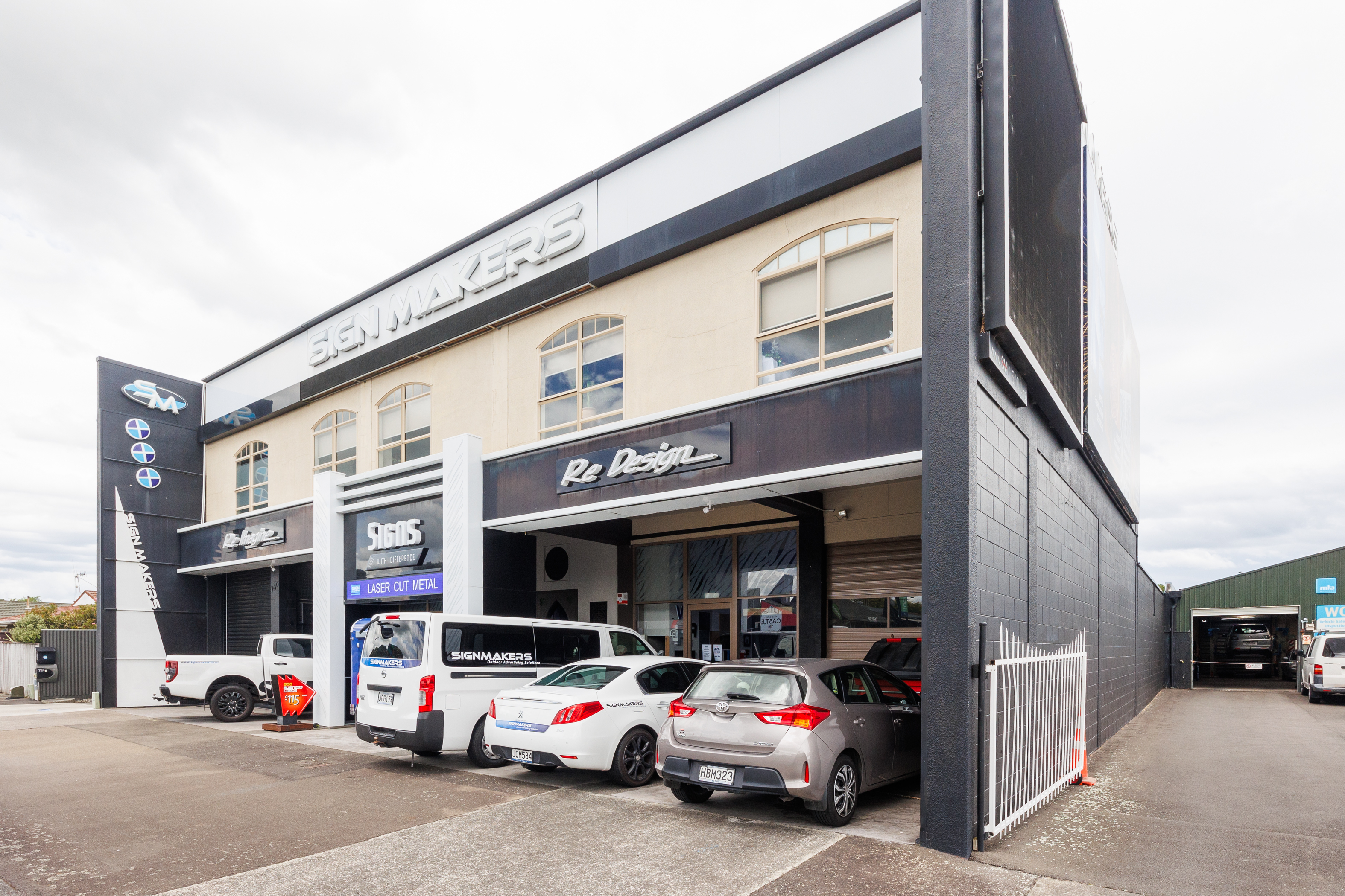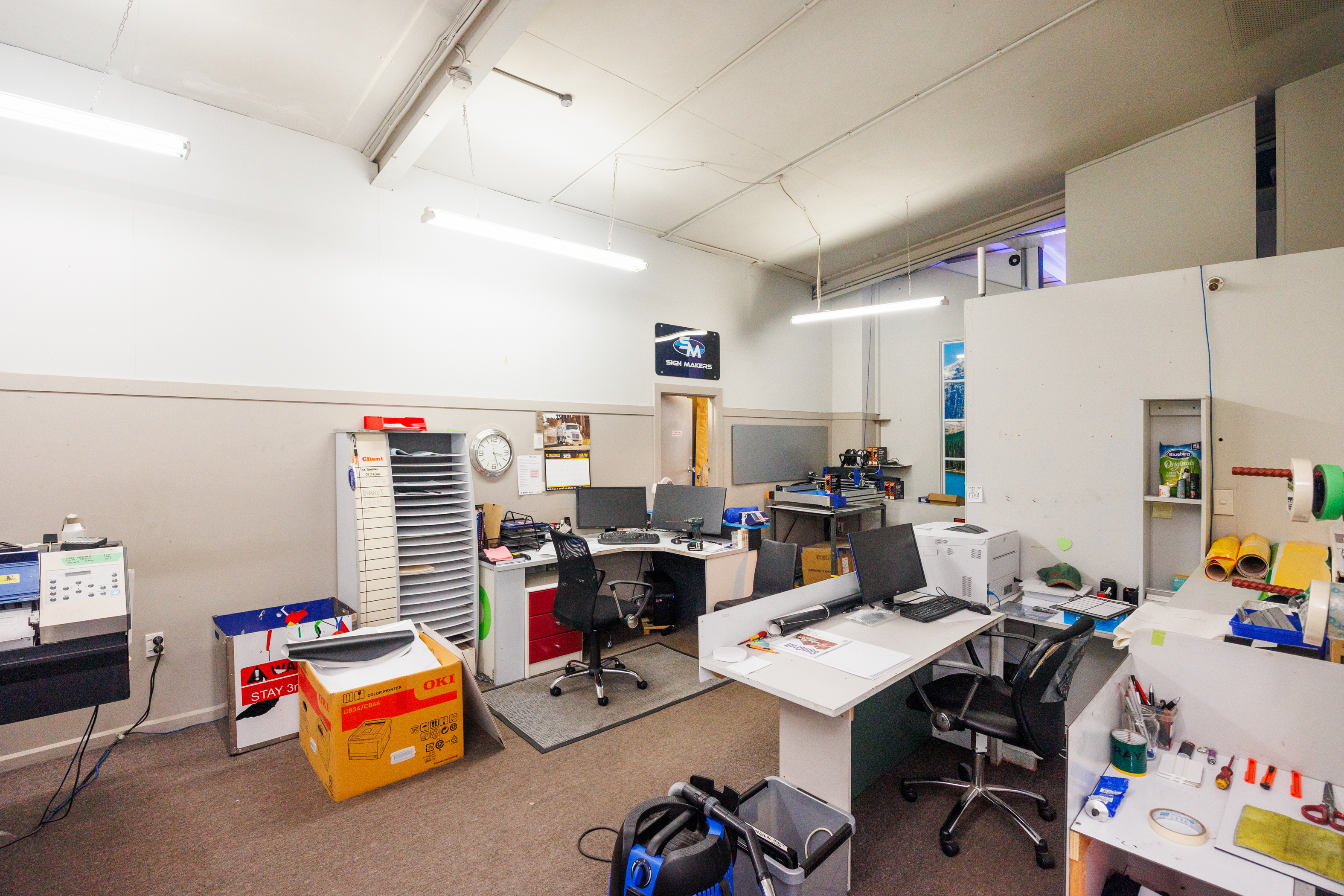 The home of Signmakers is for sale. This building comprises: • Ground Floor of 512m2 (more or less). • Comprising manufacturing/warehouse space which includes various workroom/workshop area with two kitchens and two toilets. • This ground floor is also set to be split into two tenancies if needed. • Access from Main Street is past any one of five car parks into the Signmakers reception or into the internal porch which provides access to the upstairs apartments, with each apartment has its own front door and staircase. • First-floor apartments 144m2 (more or less). + 96m2 decking. • Three-bedroomed apartment, four years left on a five-year lease. • Two-bedroomed apartment + study currently occupied by the owner. • The interior fittings are of a high standard, both apartments have individual outdoor areas and car parks available.
