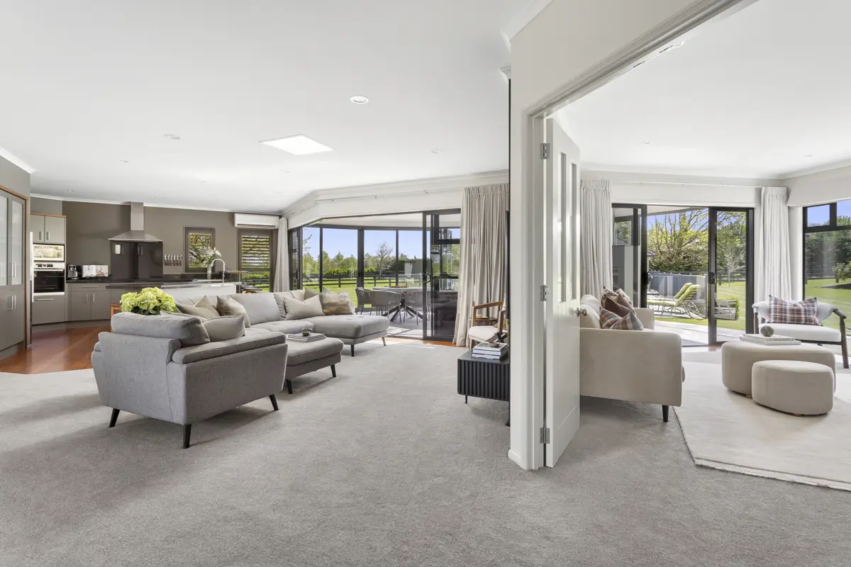 This is something truly special — an exceptional lifestyle property where luxury living meets the beauty of the Waikato River. Perfectly positioned just ten minutes from Cambridge and fifteen to Hamilton, this stunning 4.2ha Tamahere property sits proudly at the end of a private, tree-lined driveway. With easy access to the Tamahere Country Walkway and Te Awa River Ride across the road, and the revered St Peters School only minutes down the road, this is a secluded retreat in one of the Waikato’s most desirable rural locations. At the heart of the property is a beautifully designed 400sqm (approx) family home, built with tilt-slab construction for timeless strength and style. The open-plan kitchen, dining, and living areas flow seamlessly to a separate formal lounge and a spectacular glass-enclosed portico featuring an impressive open fireplace with an inbuilt pizza oven — the ultimate year-round entertaining space, complete with heated tiles. The master suite is a true retreat, with a luxurious ensuite fitted with a Bluetooth speaker, and a generous walk-in robe with more than enough shoe space to keep any lady happy. With four additional bedrooms (one with its own ensuite), a family bathroom, separate powder room, office, attic rumpus or sewing room, and triple garaging with a mudroom wash-up area — this home really does have it all. Outside, the fun continues — a heated pool with glass balustrades, in-ground trampoline, and a 70sqm (approx) pool house complete with kitchenette, bathroom, and laundry. Summer entertaining just works here — drinks by the pool or a barbecue with friends and family will be a dream. The land is beautifully fenced with classic black post-and-rail and is easily managed, with a central race leading to the paddocks and down to the river. Extensive native planting creates a cool, forest-like retreat along the riverbank, while a four-bay (two lockable) shed keeps the farm machinery and toys sorted. This property is one of only a few with direct access to the Waikato River and with riparian rights — featuring a private riverside entertaining area with a rustic shed, open fire pit, and barbecue zone. It’s the perfect place to gather with family and friends and watch the river drift by. And when the Summer is here and the water runs low, a sandy beach appears — inviting endless summer adventures. This property truly has it all — luxury, lifestyle, and location. Easy access to the International Airport and the expressway, it is the complete Tamahere package and will no doubt be popular. If this sounds like your kind of real estate, don’t hesitate to give us a call.