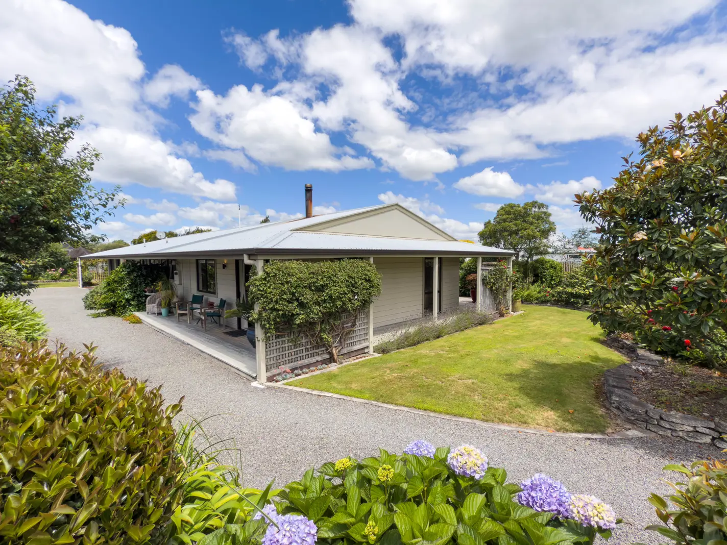 This attractive, lovingly renovated and maintained home sits surrounded by beautiful and equally lovingly maintained landscaped grounds and gardens showcasing perennials, shrubs and trees including numerous fruiting varieties. Its perfect positioning captures all day sun which you will enjoy at times and places when and where you most appreciate it. First impressions as you step inside are ever so positively influenced by immaculately presented light and airy open spaces encompassing a recently installed high-end kitchen, a formal dining area and large living room cleverly configured to include an integrated but separate living space ideally suited to enjoying a quiet read and gazing upon the garden. Cathedral ceilings add a feeling of spaciousness as do large windows and multiple ranch-sliders, while a ceiling fan, DVS, free-standing wood-burner and heat-pump ensure comfortable living all year round. Saying this home affords excellent indoor-outdoor flow is an understatement with all living areas and each of the bedrooms opening to external decks - the lounge deck forming part of a private garden haven where you will delight in al fresco dining with family and friends. The home offers three double bedrooms, all with built-in wardrobes including a small walk-in robe in the master, and a generous main bathroom with bath and separate shower. The Master bedroom comes with ensuite and an additional toilet is accessible both from the central hallway and laundry. Three hall cupboards more than amply cater for storage while the central hallway linking bedrooms and living areas also gives you the convenience of internal access to a large double garage and workshop. If you are looking for a home that you can simply move into and enjoy then this splendid, immaculate home with its stunning grounds and gardens is definitely for you. Whether you are needing to cater for a growing family or are contemplating downsizing but retaining the means to accommodate family stays as well having the space to pursue interests and a garden to enjoy, you must consider this home. Please call me to arrange a time to view or join me at an open home and experience for yourself the many outstanding features this exceptional property has on offer.