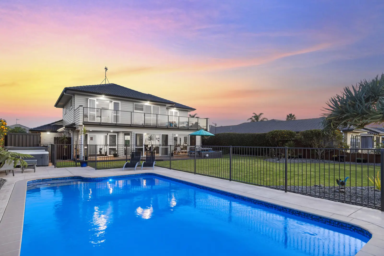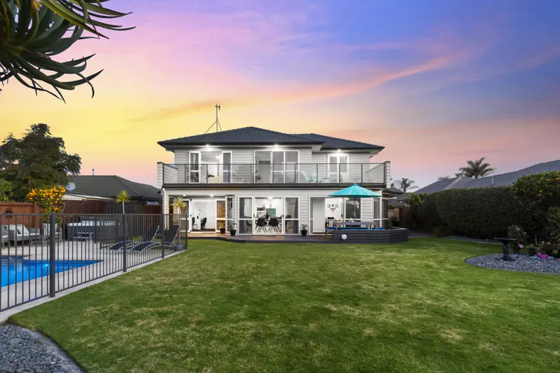 Facing north, drenched in all day sun and substantial in its makeup, this home is not to be missed. Occupying an elevated position to take full advantage of glorious sunsets and horizon views. Located in the popular Papamoa, sitting proudly on 790m2 and backing onto the gorgeous waterways, this home is a crowd-pleaser. Attractive and practical, windows are prolific in this sun-drenched home. Ranch sliders spill out from both living areas to the poolside. Perfect for that dream lifestyle. Gorgeous gardens, manicured lawns and mature trees dotted throughout the property provide beautiful birdlife and fill the air with song. From the moment you arrive at this beautifully presented home, you are greeted by the pillars that lead through to the formal entrance and grand staircase, really setting the scene for what the home has to offer. After a recent full reclad, the current owners have adored the sunny poolside days, open plan living, short walks to the Papamoa Plaza and of course, the beach. The downstairs of this sizable home is one of the bedrooms, two light-filled living areas with floor to ceiling windows, a family bathroom, the perfect study nook, separate laundry & double internal access garaging. Moving upstairs you will find four more bedrooms, each with its own breath-taking outlook, another family bathroom, plus the master bedroom with ensuite, walk-in robe & massive balcony to enjoy your morning coffee. The vast, fully fenced backyard means entertaining and living here is a breeze. A great entertainer, beautifully presented with numerous leisure spaces and plenty of space for all family pursuits, this home, complete with all the extras, offers its new owners a relaxed ultra-stylish lifestyle in their own private haven.