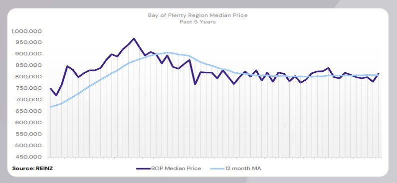 The median price for the Bay of Plenty decreased by 0.2% year-on-year to $815,000