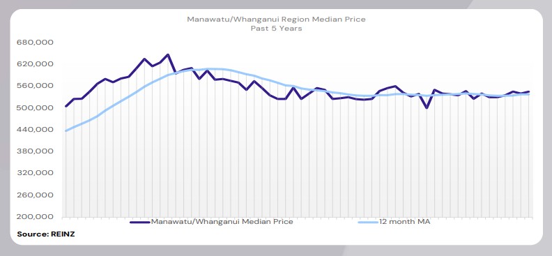 The median price for Manawatu/Whanganui decreased by 0.9% year-on-year to $545,000