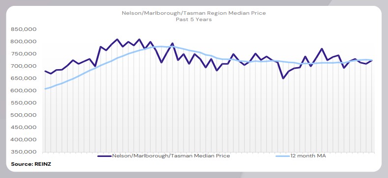 The median price for Nelson decreased by 0.5% year-on-year to $656,500. The median price for Marlborough decreased by 11.4% year-on-year to $681,500. The median price for Tasman increased by 1.5% year-on-year to $791,500.