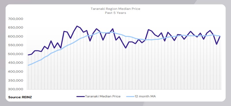 Taranaki’s median price decreased by 1.6% year-on-year to $600,000