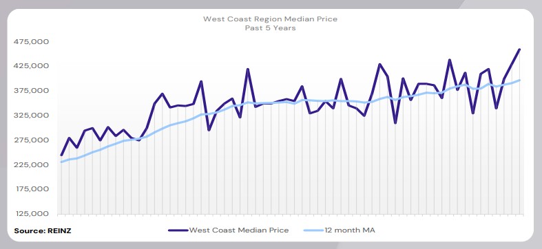 West Coast’s median price increased by 17.9% year-on-year to $460,000 – a record high for the region.