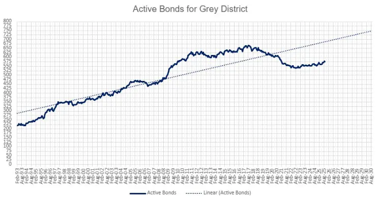 Rental stock stays relatively tight. Active bonds indicate a modest pool of properties, and new supply is constrained by slower construction activity compared to larger regions. Demand is supported by stable population trends and a growing interest in lifestyle relocations. While Grey District’s population growth is modest, it has remained steady over decades, avoiding the volatility seen in some rural areas.