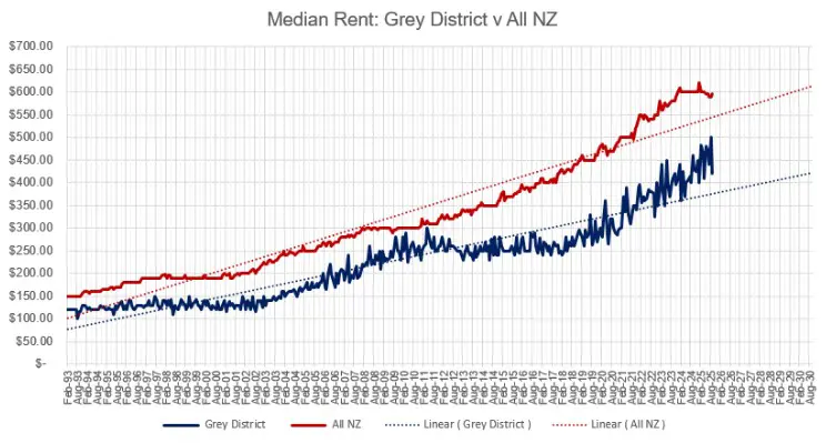 As of September 2025, the median weekly rent in Grey District is $420, marking a steady increase over the past two years. This growth reflects a tightening rental market, driven by limited housing supply and consistent demand from both locals and newcomers attracted by lifestyle and affordability.