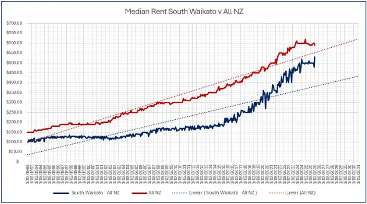 A defining shift in South Waikato’s rental market occurred in 2017, marking a structural reset rather than a temporary spike. From 2013 to 2016, median weekly rents typically sat around $190 - $210. In 2017, median rents lifted to around $220 per week. By 2018, rents had moved to approximately $250 per week. Fast forward six years to 2024 and the median rent increased to $500 per week.