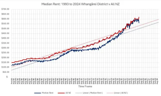 The city's blend of industry, lifestyle, and natural beauty continues to attract both residents and investors alike. As of May 2025, Whangārei's rental market reflects a complex interplay of high rental prices, shifting demand, and affordability challenges, particularly for lower-income households. Despite the relatively stable rent increases, affordability remains a significant concern. The graph highlights the step increase in rents since approximately 2018.