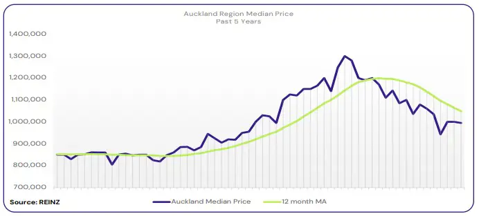 Auckland’s median price has again slipped under the $1 million price point with its median now at $995,000 — a 15.0% decrease year-on-year.