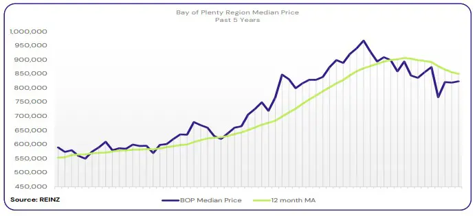 Bay of Plenty’s median price was down 7.9% year-on-year in April to $824,500.