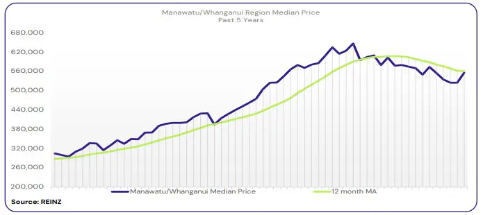 Manawatu/Whanganui’s median price decreased 4.1% year-on-year to $556,000.