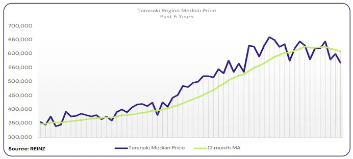 The median price in Taranaki was down 9.1% year-on-year to $568,000.