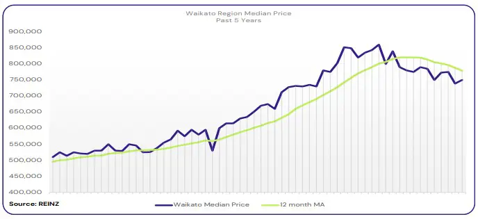 Median prices in Waikato decreased 12.8% year-on-year to $750,000.