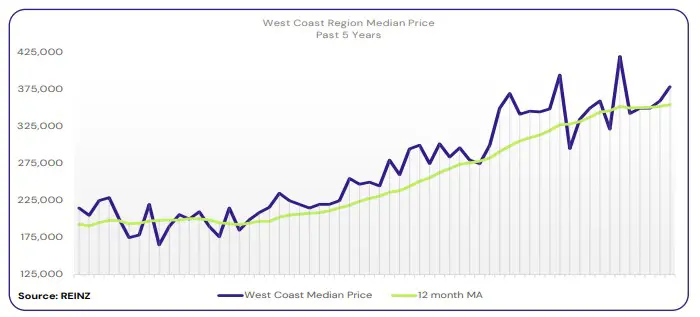 The West Coast bucked the national trend with an 8.6% increase in its median price year-on-year to a new median price of $379,000. The Grey District reached a record median price of $398,000.