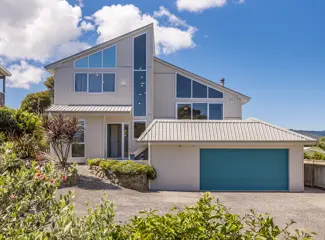 Entering the property through a skylit walkway, internal access is provided to the generous double garage to the right of the entrance hall. To the left, the first guest bedroom opens out to the deck and on to the heated pool, with an expansive view encompassing Kapiti Island and beyond. A ...