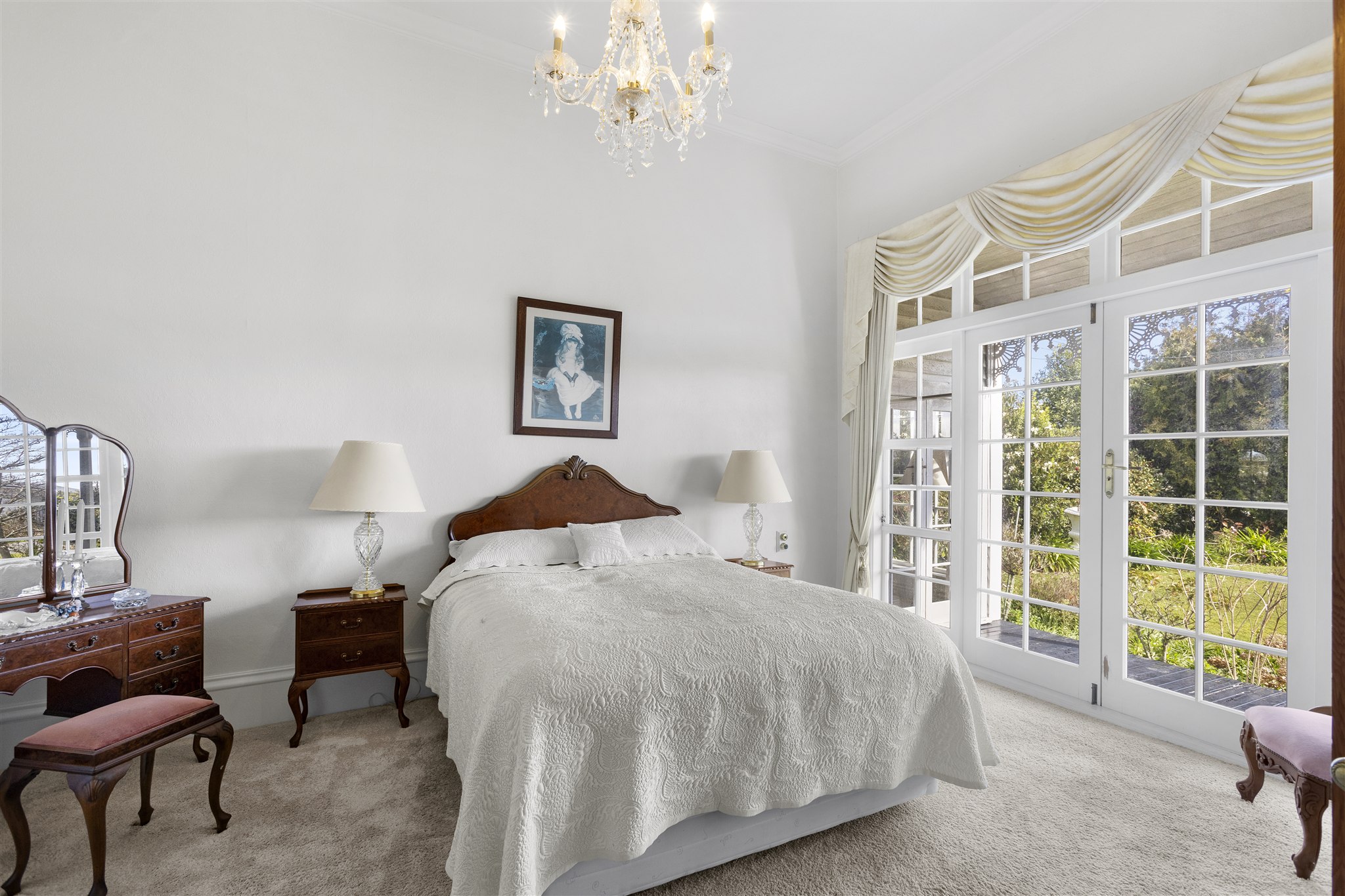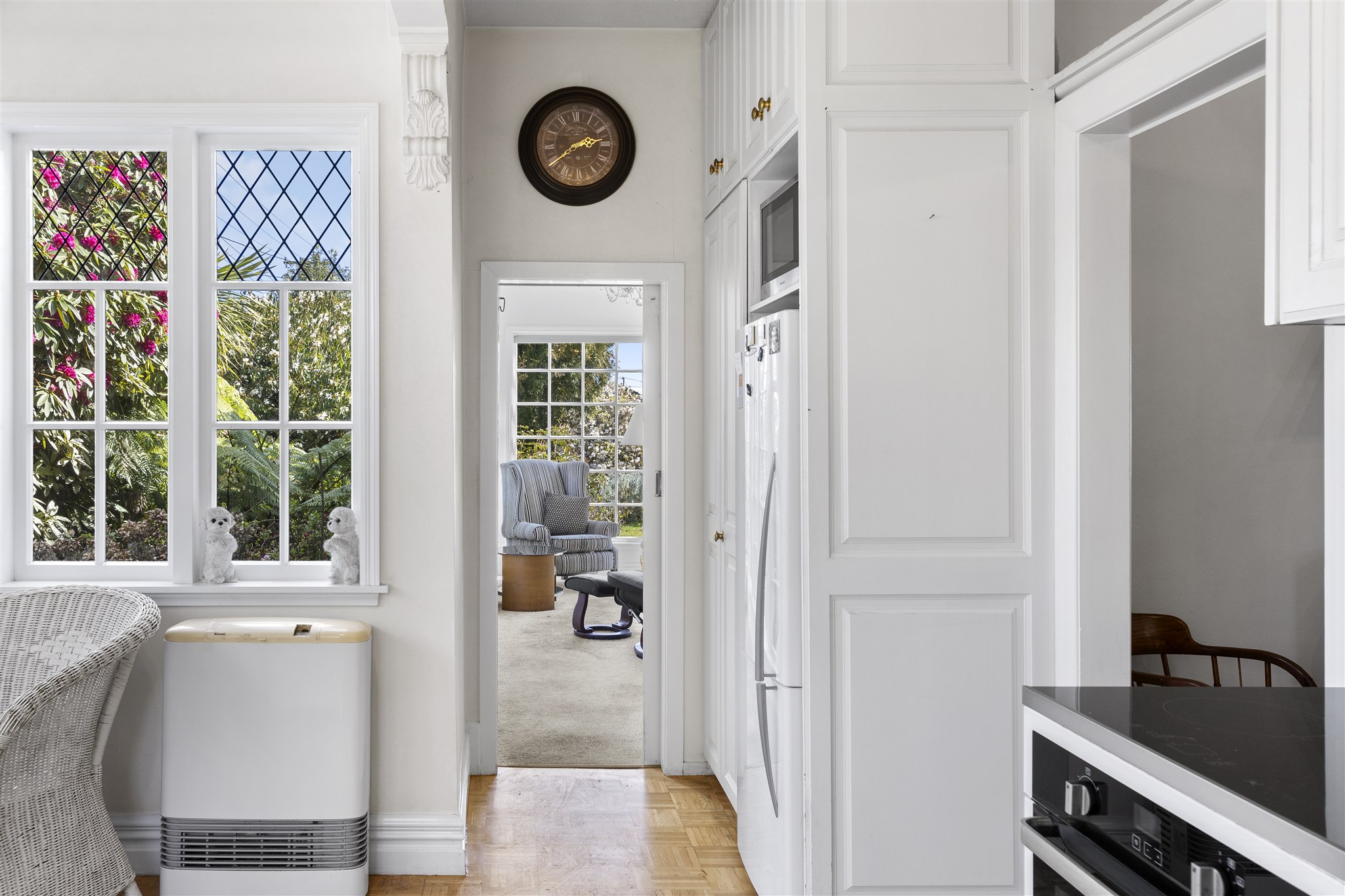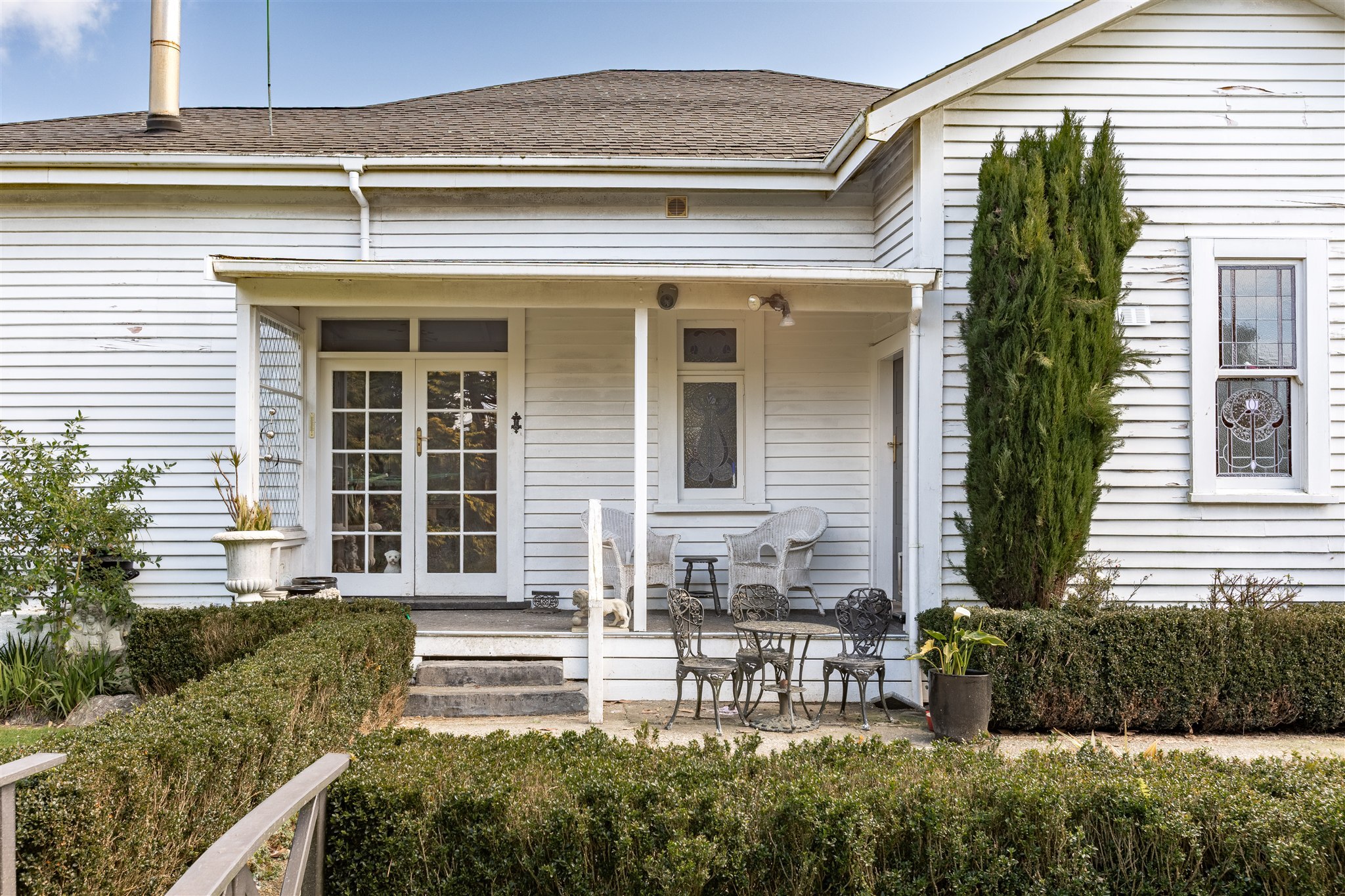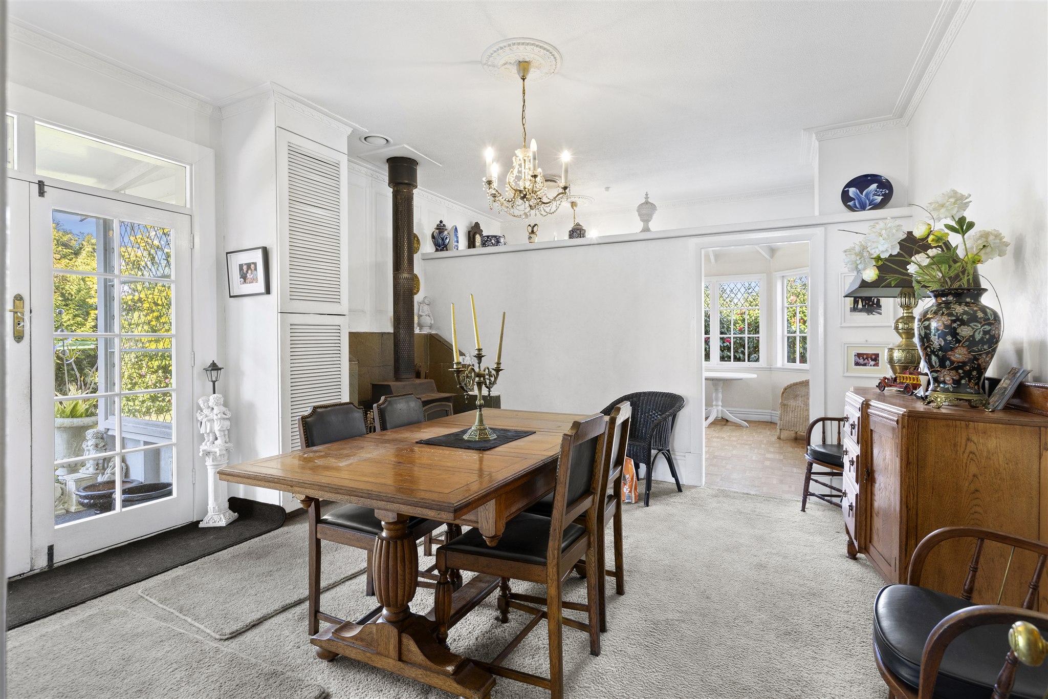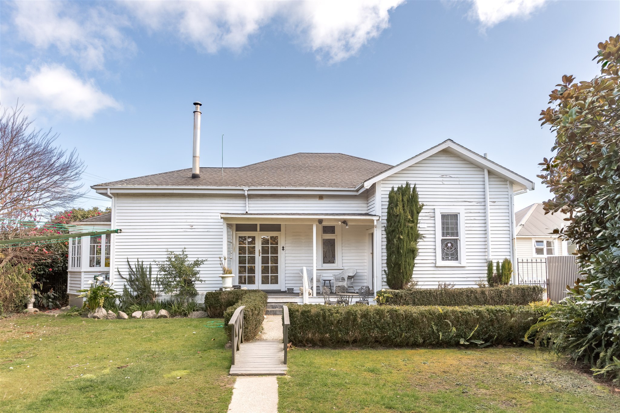 This villa showcases timeless character with its weatherboard exterior, decorative fretwork trim, and various leadlight windows. The interior is highlighted by elegant crystal chandeliers, ornate ceiling roses, and quality drapes throughout. The well-appointed kitchen has plenty of cabinetry, alongside a combined breakfast nook, and separate dining area with a multifuel burner. There is a sunny sitting room just off the kitchen which provides a delightful all-weather retreat with a garden outlook. The formal living room offers generous space for both relaxation and entertaining and is preserved beautifully, capturing all day sun. The home features 2 bedrooms and is complemented by a luxurious bathroom featuring a clawfoot tub, separate shower, and striking geometric floor tiles. The laundry area is very spacious and tucked in the corner is a separate W/C. Set on established grounds with mature landscaping, character details, quality finishes, and flexible living spaces make this an appealing home for those who appreciate character in a home.