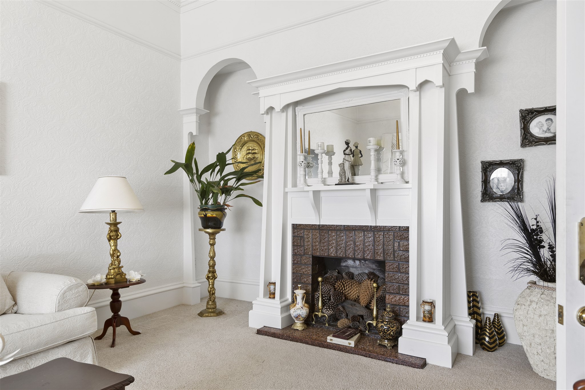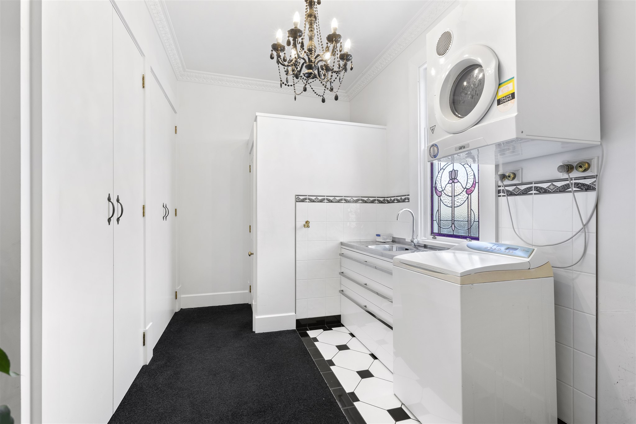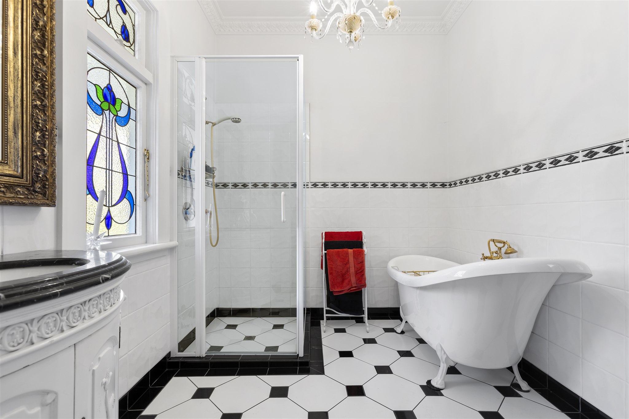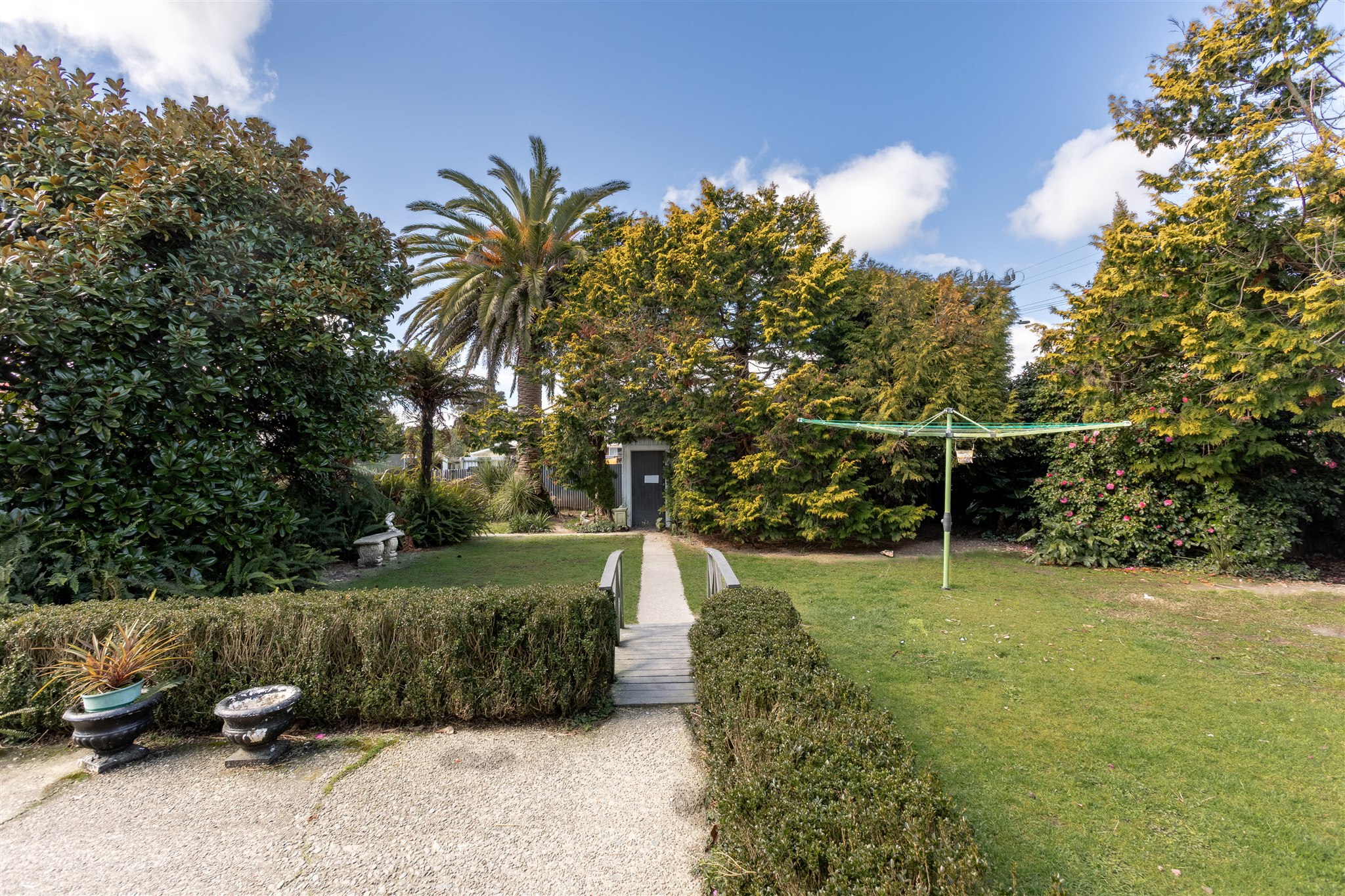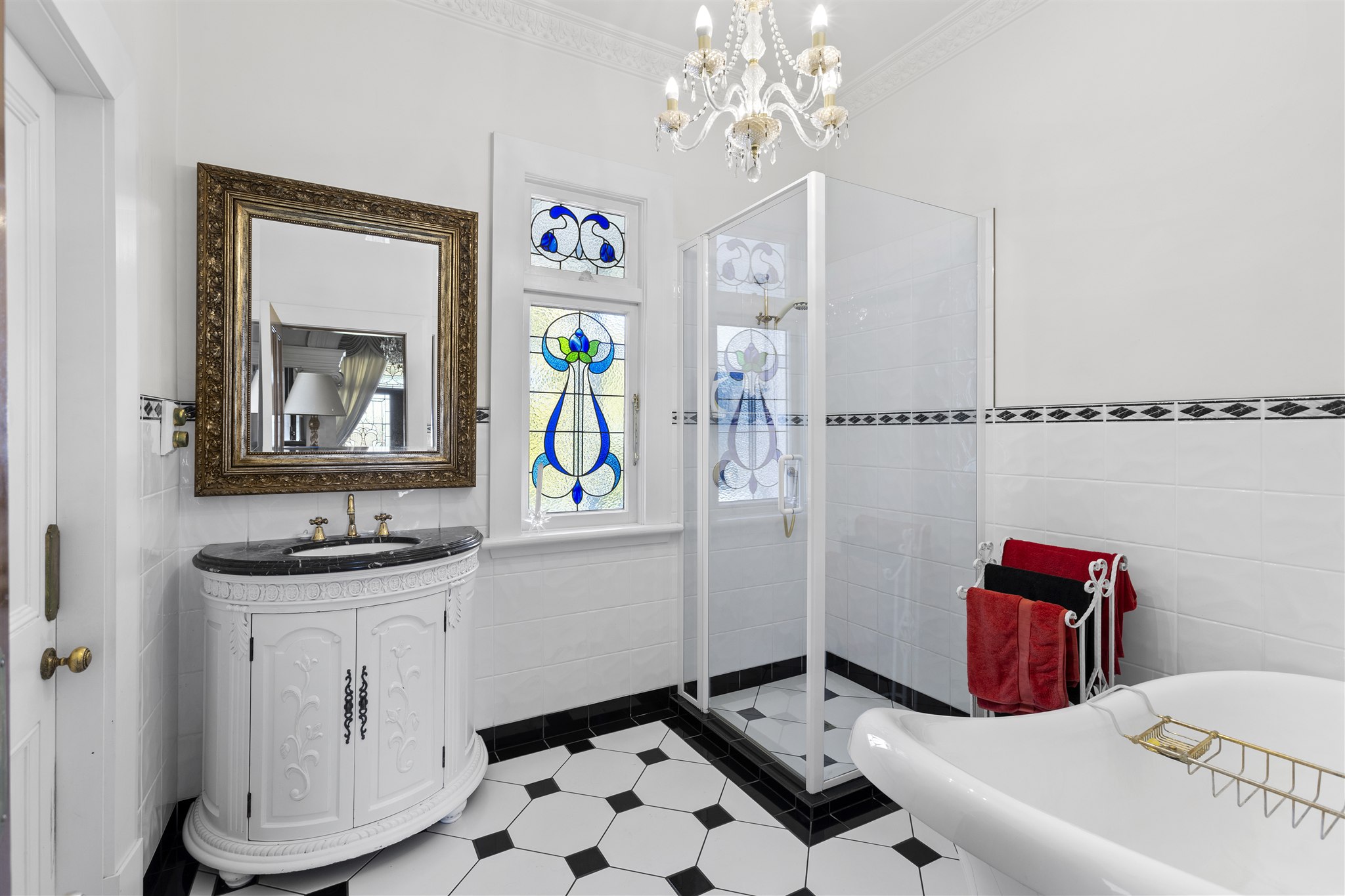 This villa showcases timeless character with its weatherboard exterior, decorative fretwork trim, and various leadlight windows. The interior is highlighted by elegant crystal chandeliers, ornate ceiling roses, and quality drapes throughout. The well-appointed kitchen has plenty of cabinetry, alongside a combined breakfast nook, and separate dining area with a multifuel burner. There is a sunny sitting room just off the kitchen which provides a delightful all-weather retreat with a garden outlook. The formal living room offers generous space for both relaxation and entertaining and is preserved beautifully, capturing all day sun. The home features 2 bedrooms and is complemented by a luxurious bathroom featuring a clawfoot tub, separate shower, and striking geometric floor tiles. The laundry area is very spacious and tucked in the corner is a separate W/C. Set on established grounds with mature landscaping, character details, quality finishes, and flexible living spaces make this an appealing home for those who appreciate character in a home.