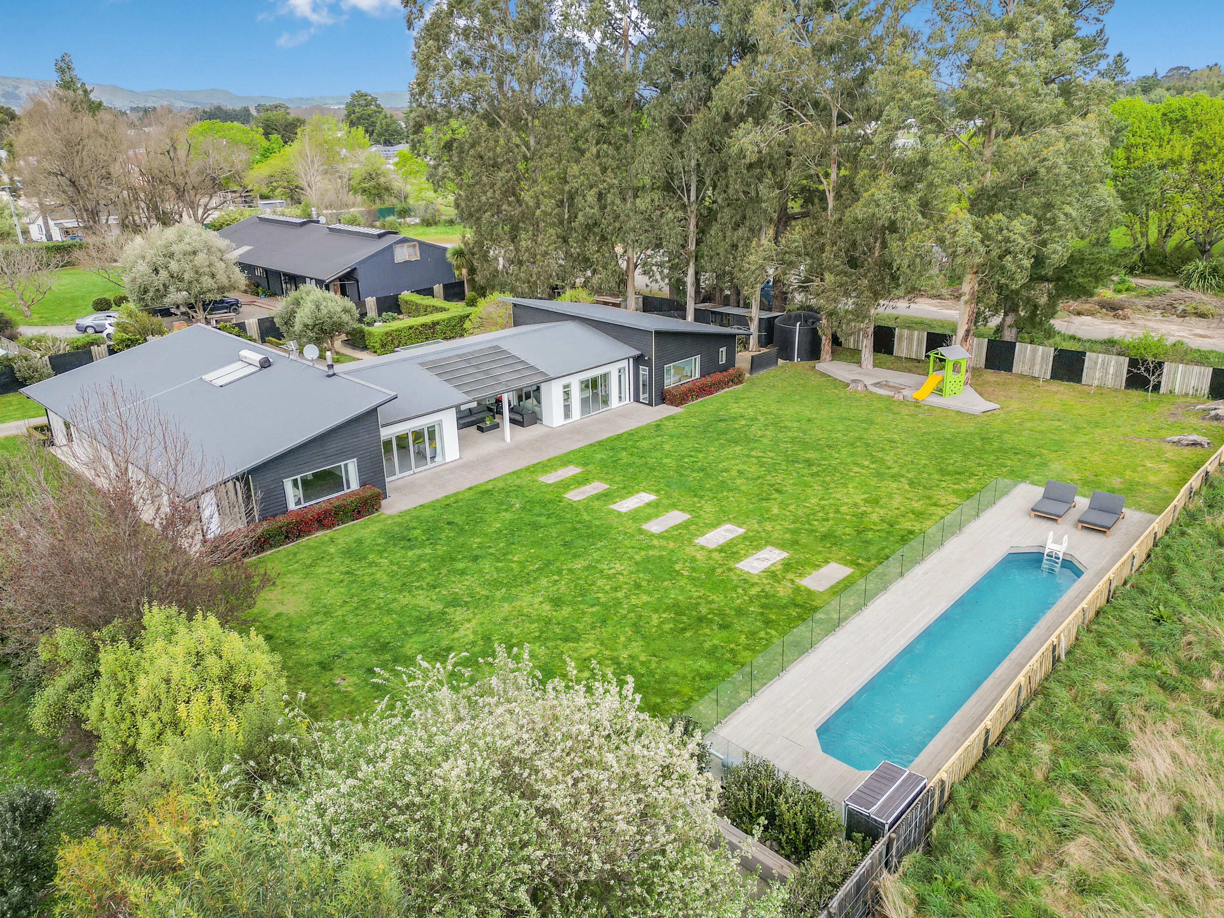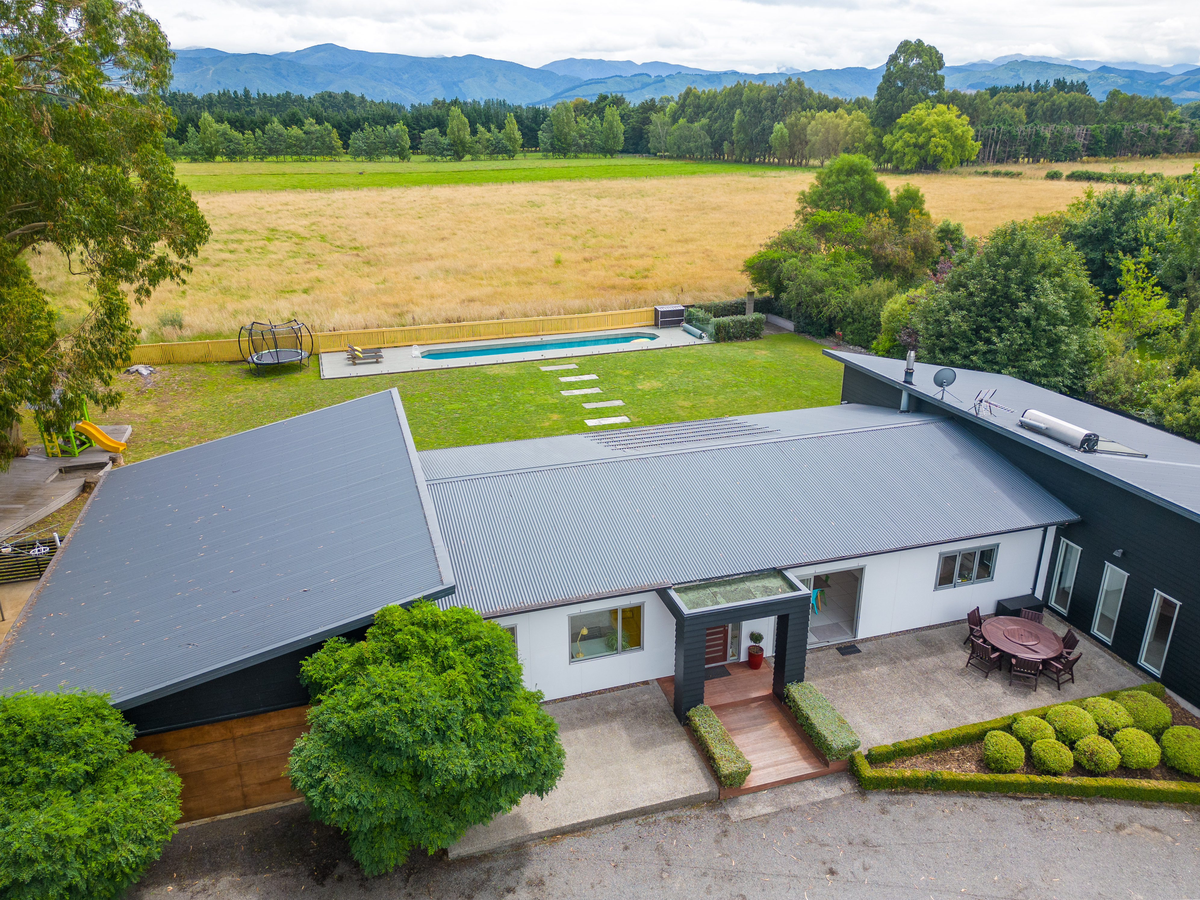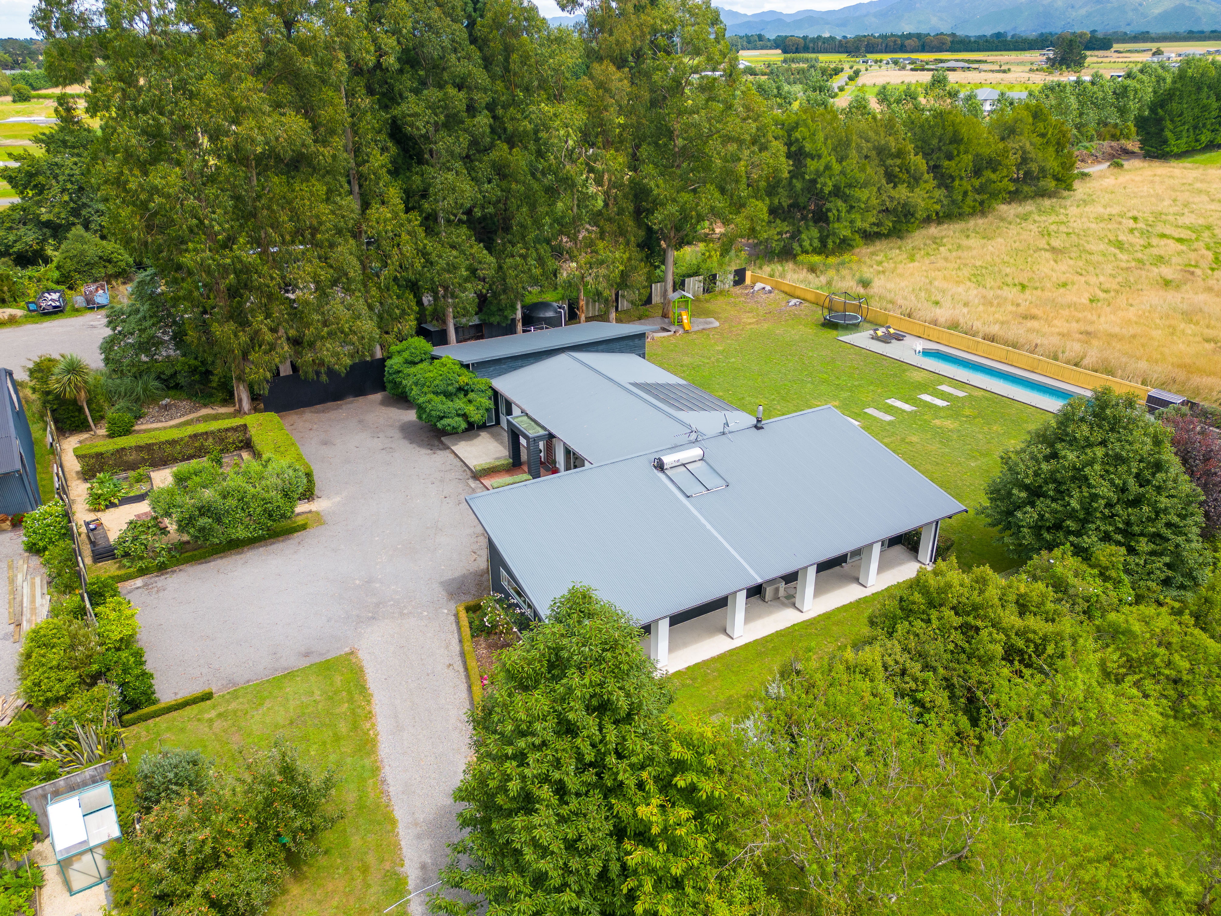 Tucked away on a private rear section, this architecturally designed Greytown home offers something rarely found in town: uninterrupted, panoramic views of the Tararua Range. From the moment you arrive, the sense of space, privacy, and natural beauty sets it apart. Crafted with contemporary flair and meticulous attention to detail, the home pairs striking design with exceptional comfort. A flexible open-plan layout anchors modern family living, supported by double glazing, premium insulation, and plush new carpet for superb year-round warmth. At the heart of the home, the expansive kitchen, dining, and living area is flooded with natural light, perfectly framing those remarkable views from dawn to dusk. A second lounge provides a peaceful retreat, flowing effortlessly to outdoor spaces positioned to capture the outlook. Accommodation is generous and well considered. The primary suite is a private sanctuary with a walk-in robe, tiled ensuite, and breathtaking morning views. Two additional double bedrooms share a beautifully finished family bathroom, while a separate guest suite with its own ensuite is ideal for visitors or extended family. A versatile office with sliding doors can become two workspaces, a fifth single bedroom, or a dedicated study/playroom. Outdoors, the home continues to showcase its setting. Sun-drenched patios wrap around three sides, offering endless places to relax and admire the horizon. A children's play area, ample sheds, double internal-access garaging, and extensive raised vegetable beds add practicality, while the sleek lap pool creates a private oasis framed by mountain views. This exceptional property combines modern conveniences, space, and truly awe-inspiring vistas - an extraordinarily rare find within an urban setting and an easy commute to Wellington. A home where the views take centre stage, and everything else is crafted to match.