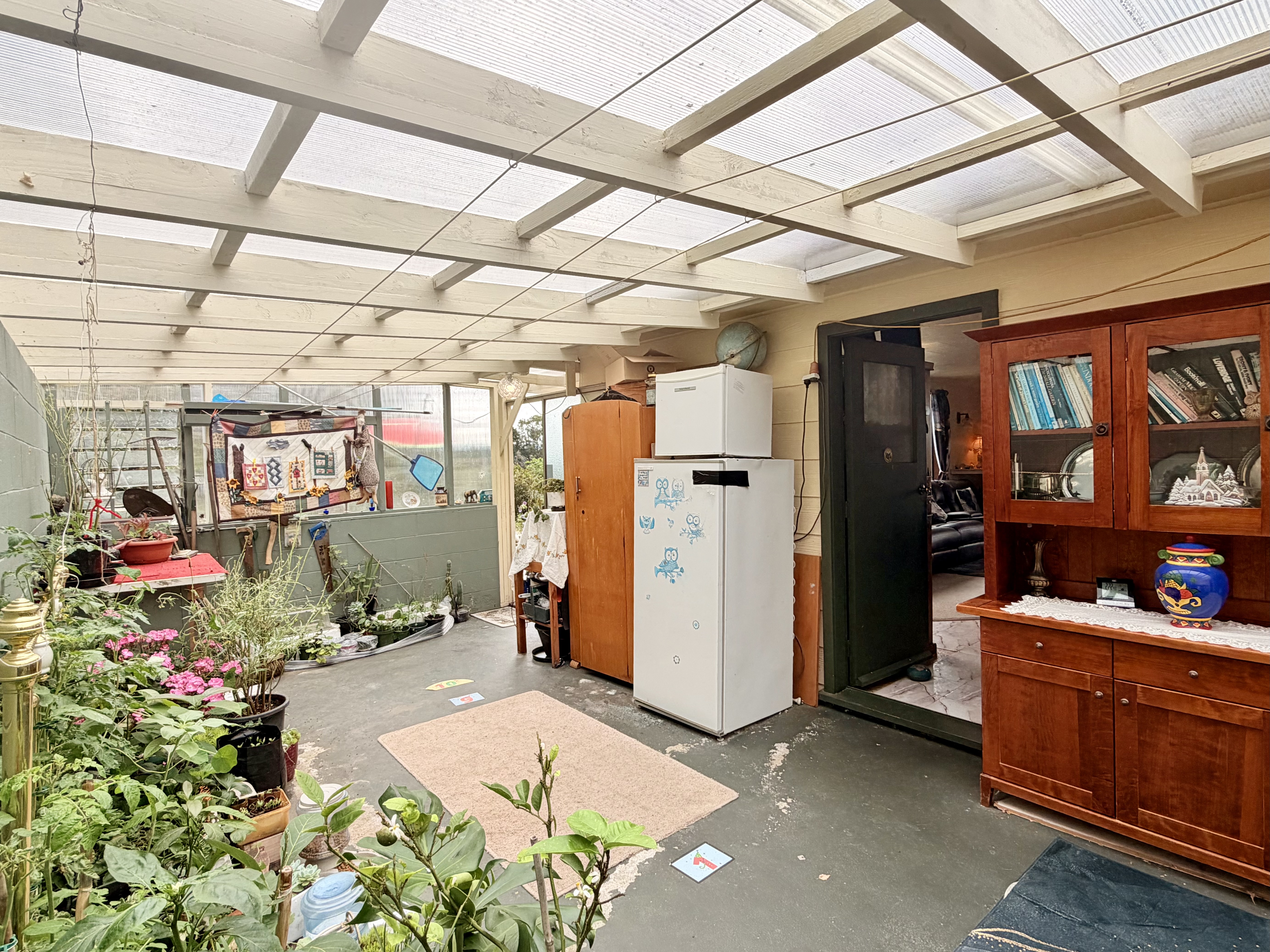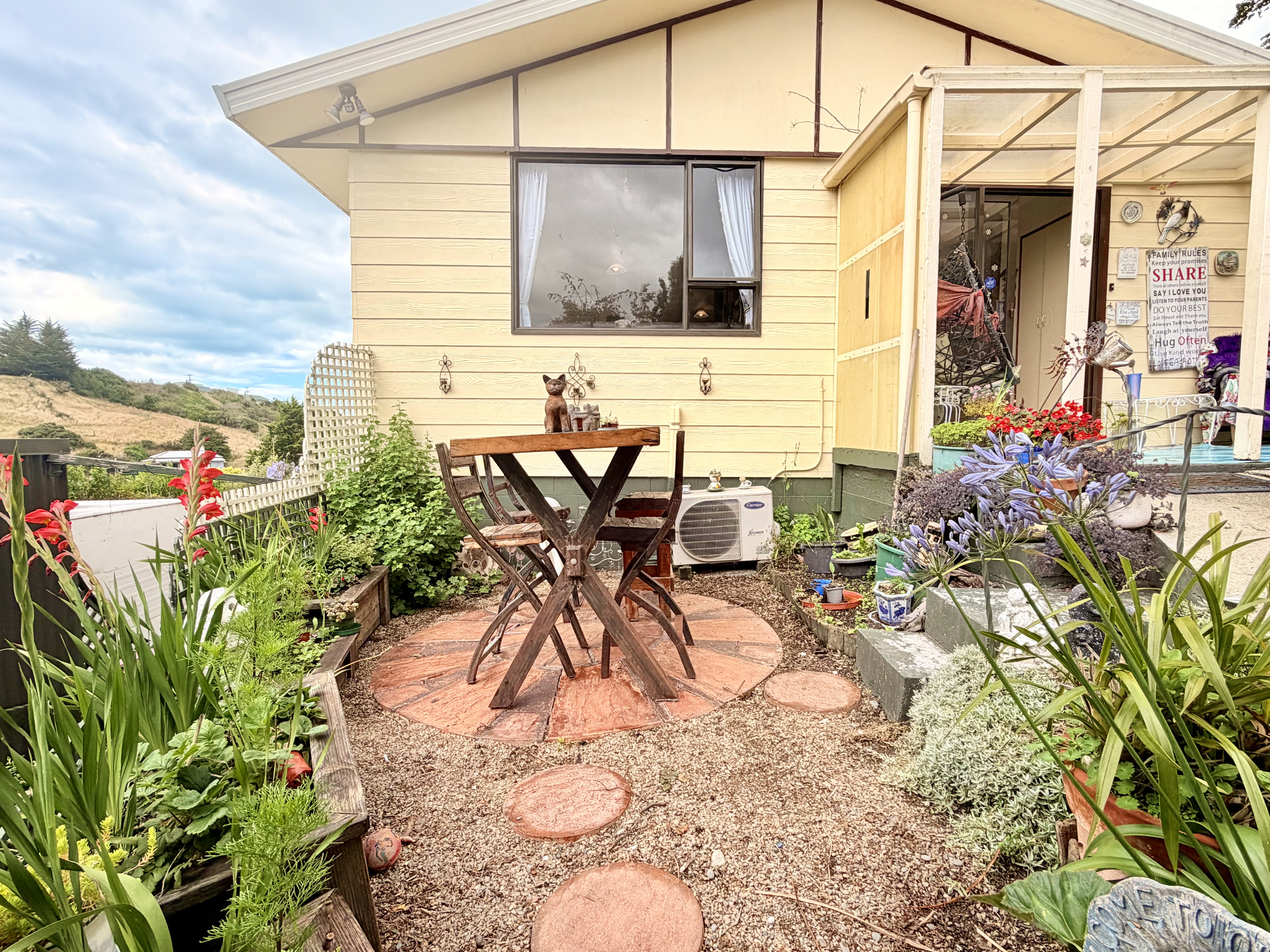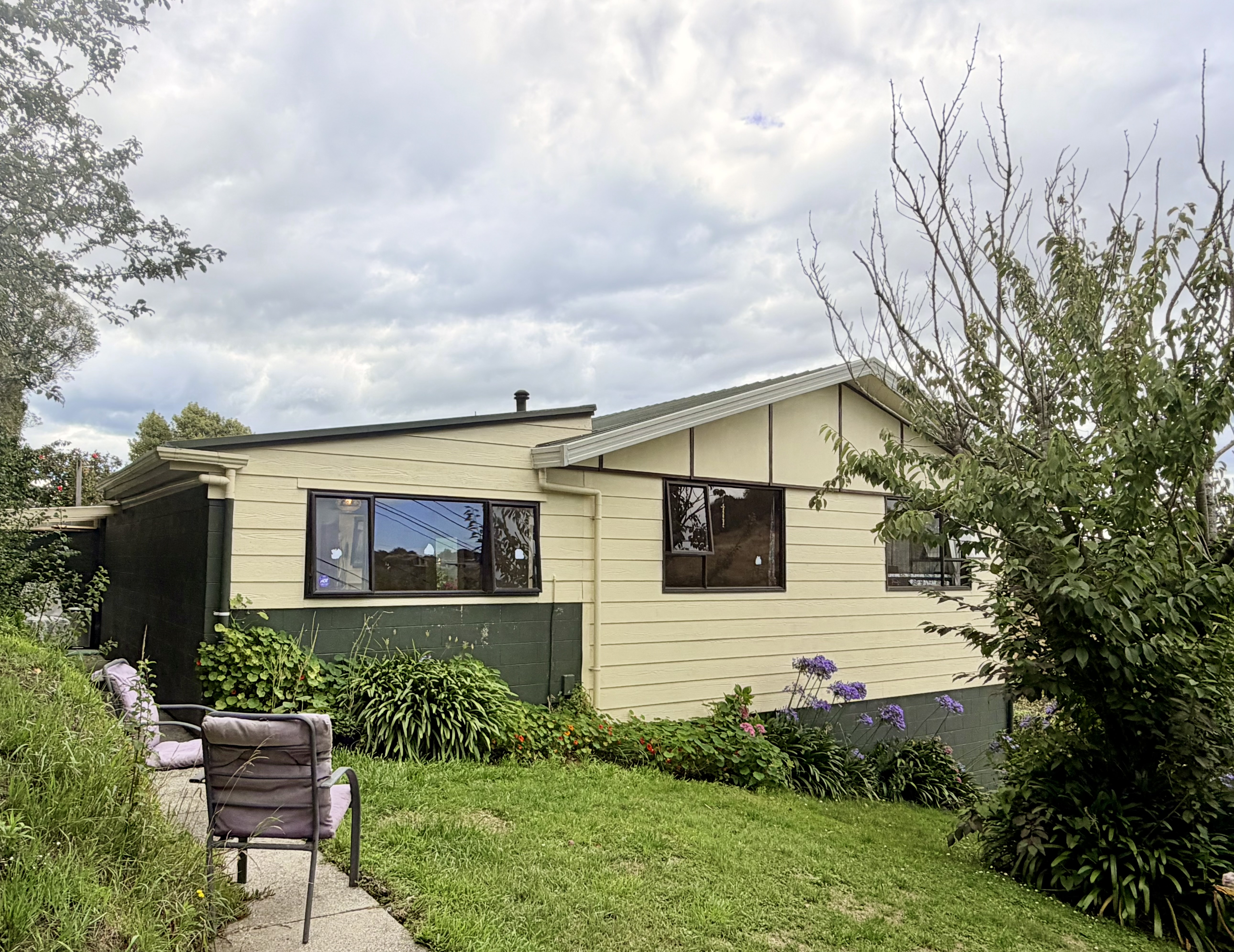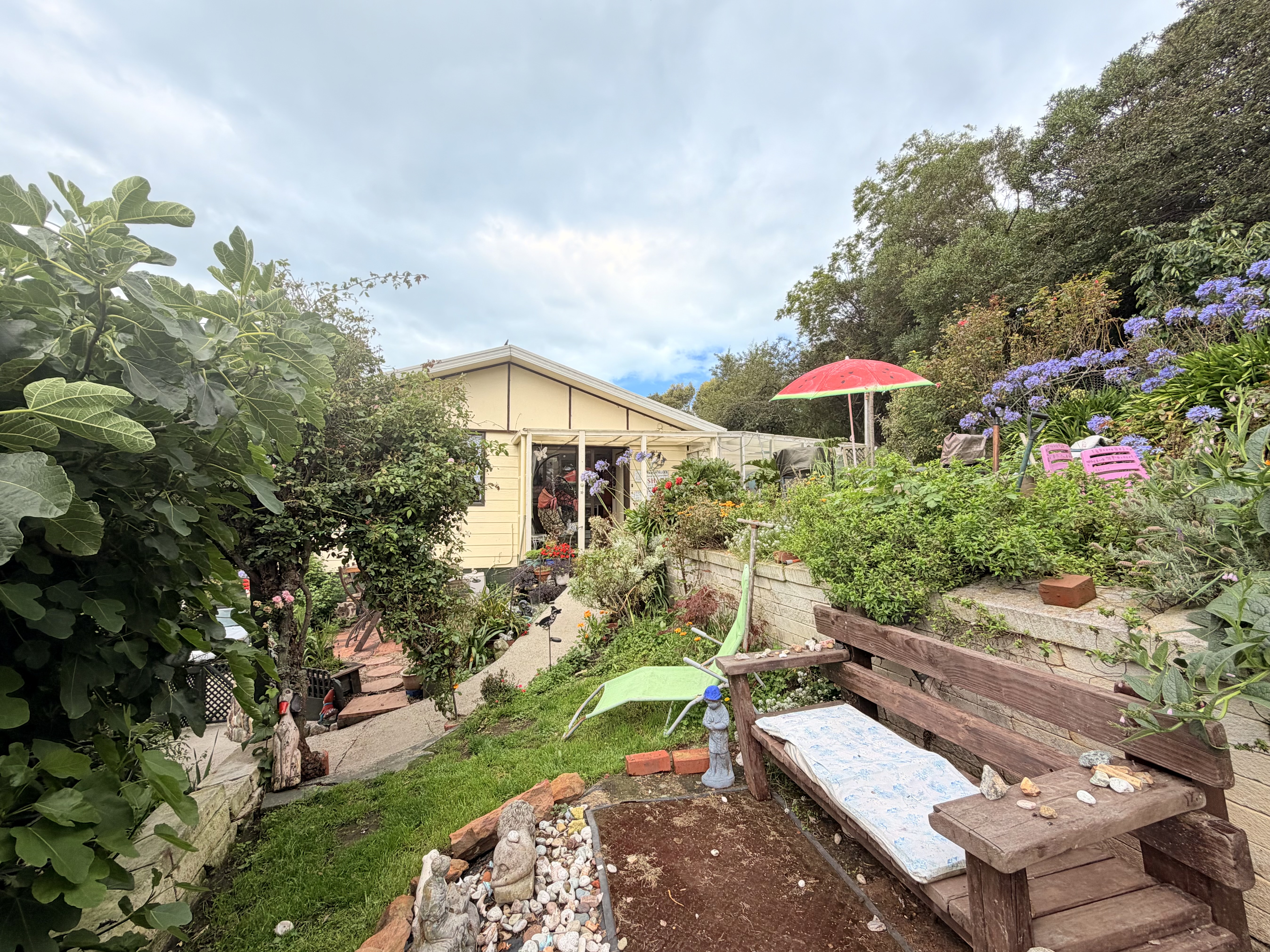 Elevated above the road with a rural outlook on a 960 sqm section sits this quirky abode. On offer is three bedrooms with open plan kitchen dining and living rooms, separate bathroom and laundry and a walk through to a warm conservatory area. Heating is by way of a log-burner on wet-back, a heat-pump and a solar panel to boost water heating. Down the internal stairs is a garage with ample storage for toys and equipment with under cover parking for two vehicles. Currently a caravan is situated in the carport which will move with the owner. Built in the 1980s of low maintenance materials, this home sits amongst apple, apricot, plum and ornamental trees and shrubs offering a quiet oasis to sit and contemplate the meaning of life. A small garden fountain, seasonal herbs and a chook run surround small seating areas designed to enjoy the outdoors. This property will suit first home buyers, those wishing to eat from the land or enjoy a peaceful existence. Come along to the scheduled open homes or call for a private viewing. To be sold under the hammer.