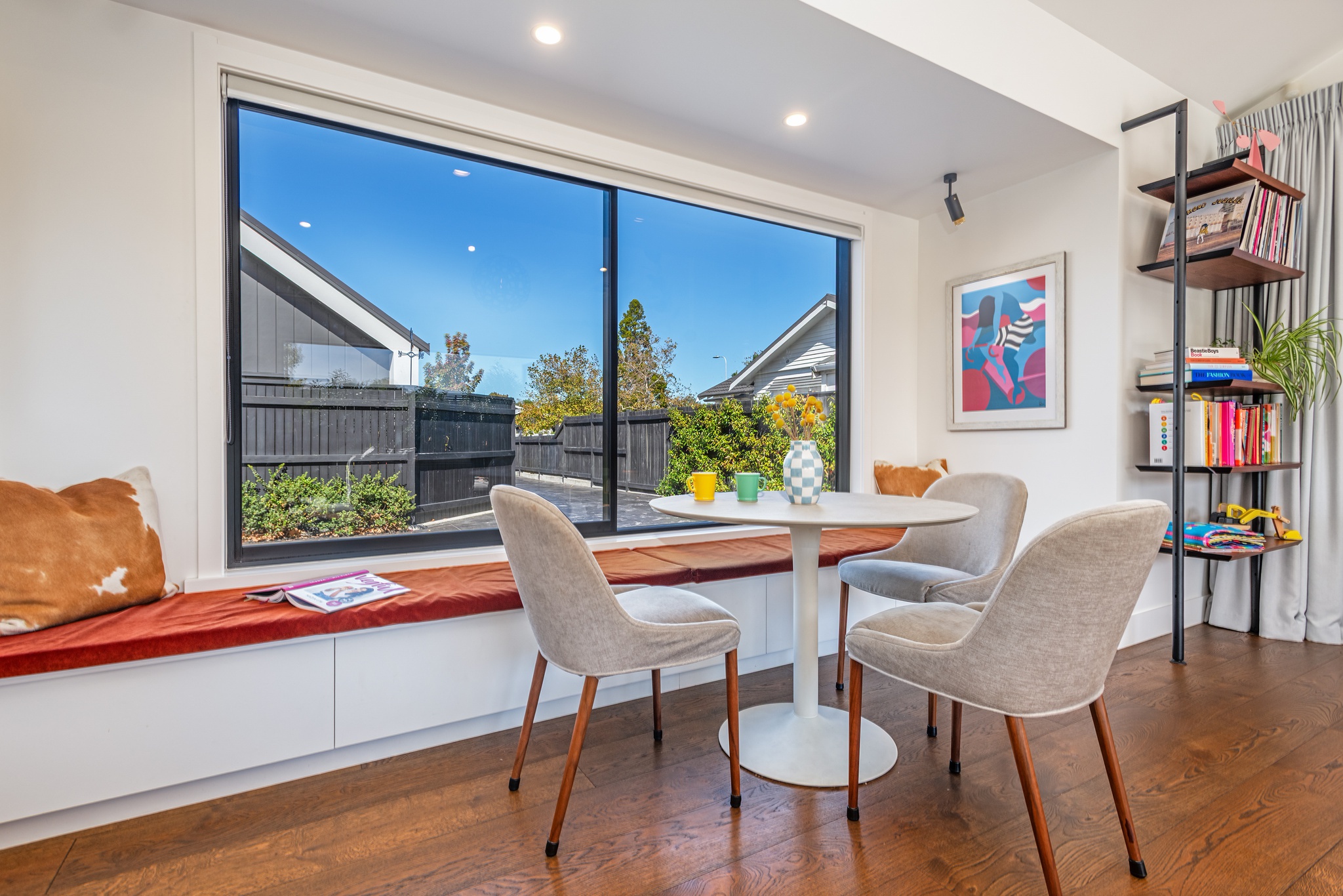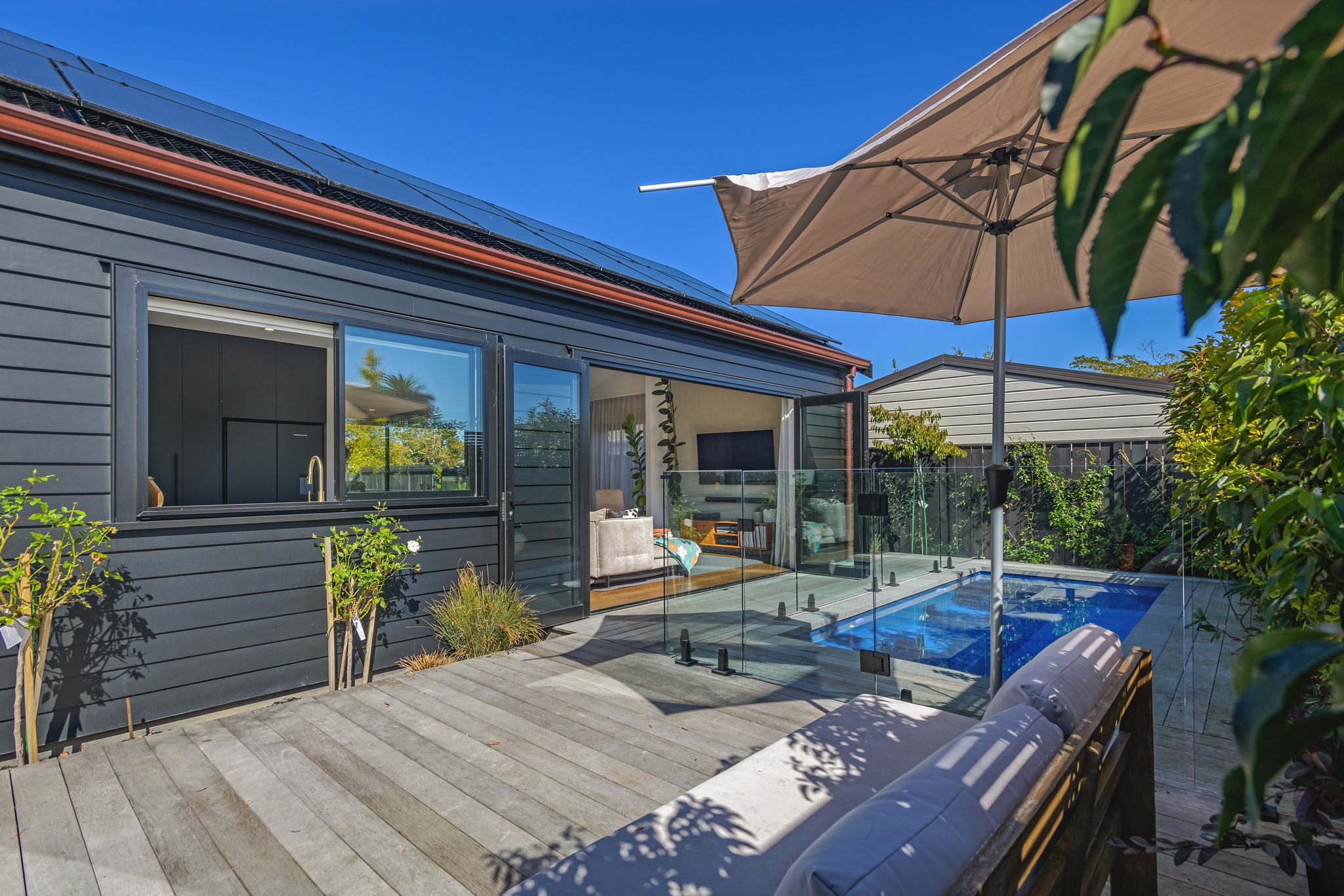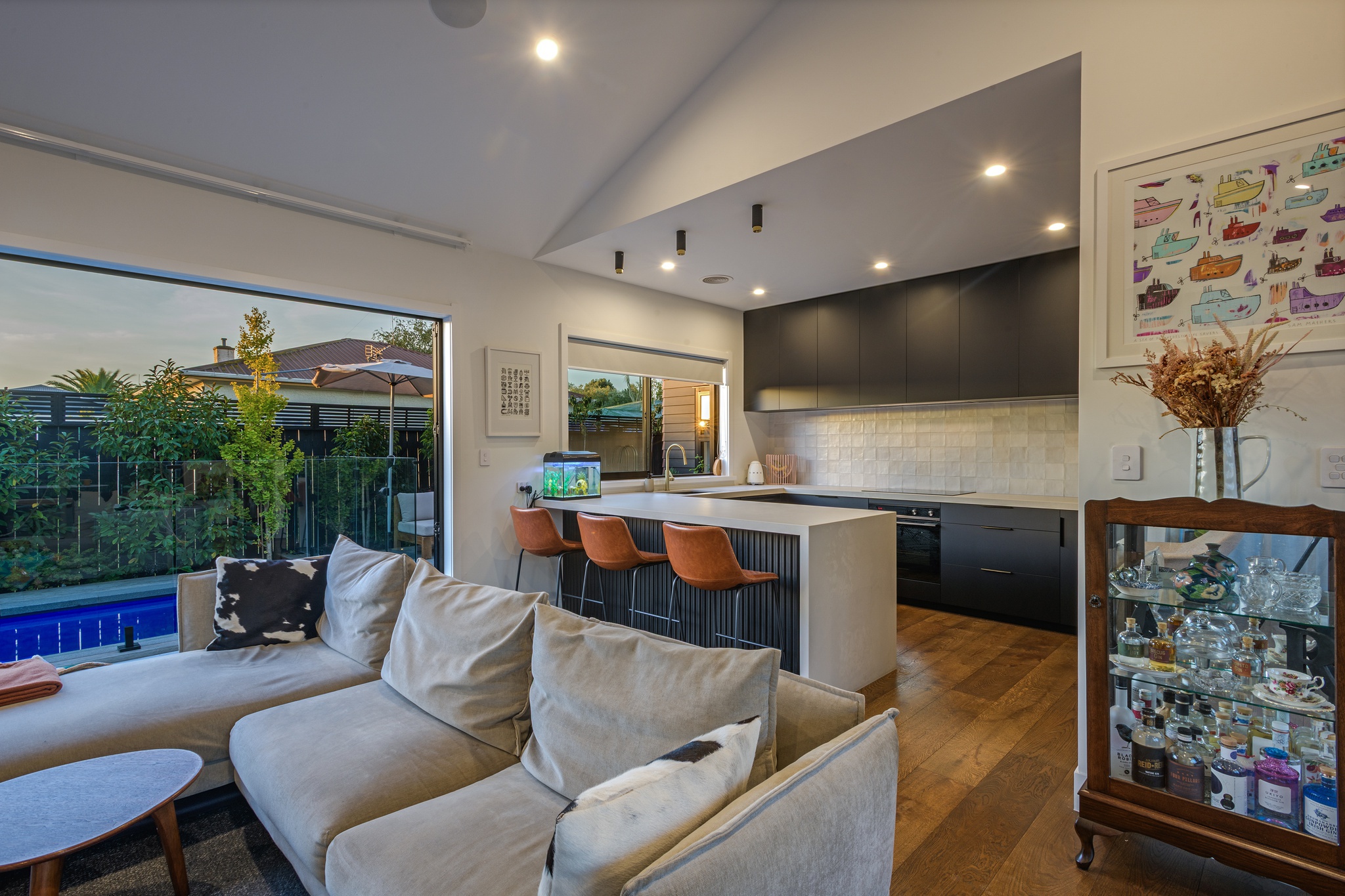 Contemporary, distinctive and high-end, yet executed with a clean minimalist flair, this central city home offers an exceptional living experience. Completed in 2022 by InHouse Construction - renowned for precision and attention to detail - this quality is evident at every turn. An open-plan living and dining area forms the heart of the home. A cathedral ceiling adds a sense of grandeur, while engineered timber flooring brings warmth, creating a space equally suited to intimate evenings or larger gatherings. Enjoy your morning coffee by the large picture window with its built-in bench seat, or gather around the breakfast bar in the striking black-and-white kitchen. Stone benchtops, a tiled splashback and sleek joinery combine to deliver timeless appeal. Positioned to capture the sun, bi-fold doors open seamlessly to a private timber deck and heated plunge pool-perfect for entertaining or unwinding. Thoughtfully designed feature lighting enhances the ambience, allowing you to enjoy this space well into the evening. The home offers three bedrooms, each with built-in drawers. The master suite enjoys direct access to the deck and pool, along with a beautifully appointed ensuite that truly sets this home apart. High-quality tiling and elegant fixtures continue through to the main bathroom and guest powder room, further showcasing the calibre of the build. A versatile, closable office nook off the hallway is a welcome addition for modern working life. Practical features include a carpeted garage with laundry facilities, ducted central heating, solar panels, and inbuilt ceiling speakers. Set in a sought-after hospital location, the property is zoned for Russell Street School and Palmerston North Boys' High School, with shops and supermarkets just minutes away. Privately positioned on a rear section, complete with an electric gate and artificial grass, this home offers security, privacy, and an easy-care 'lock and leave' lifestyle.