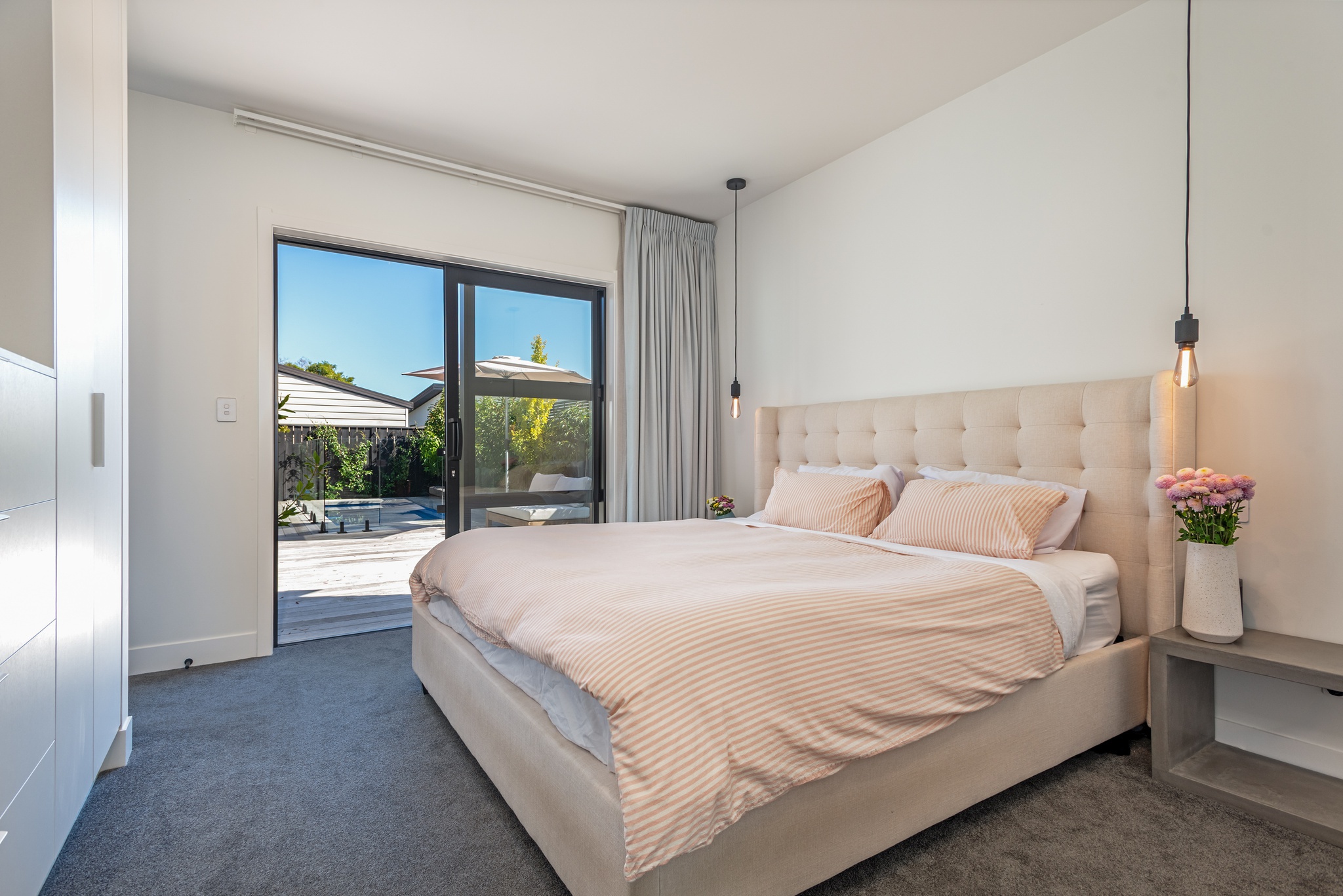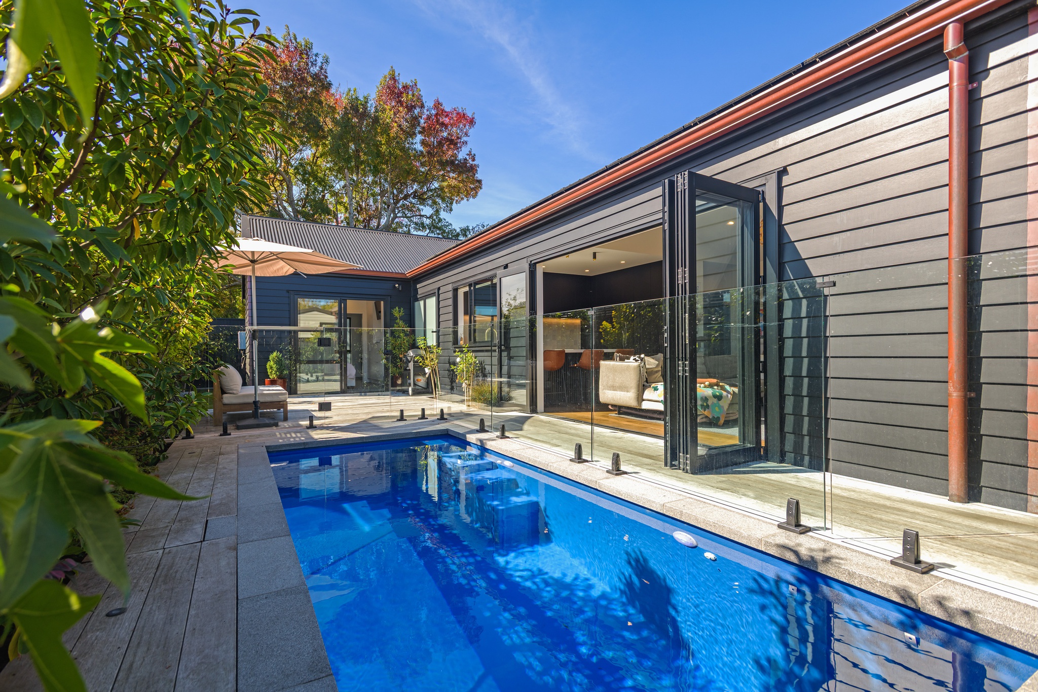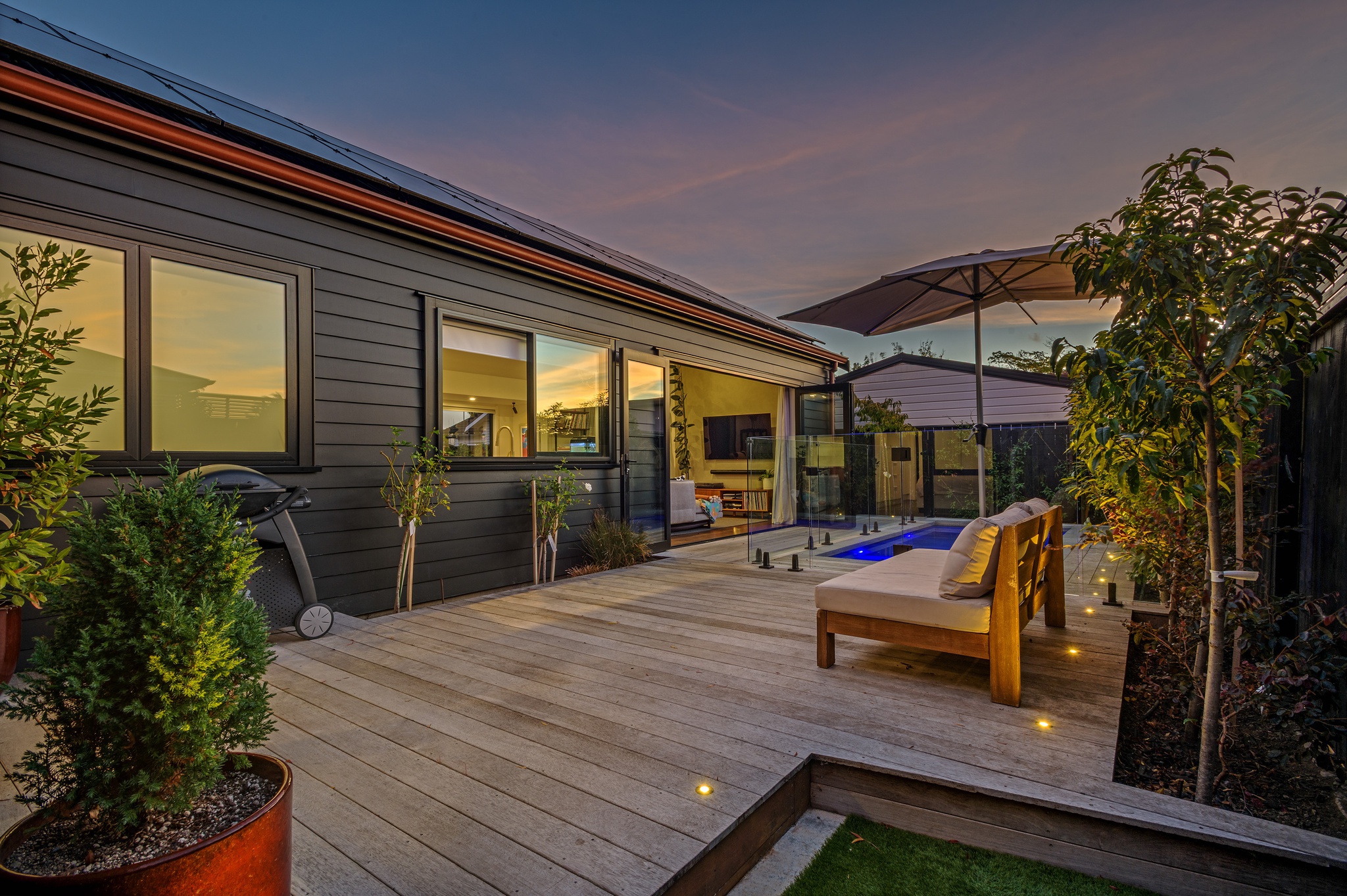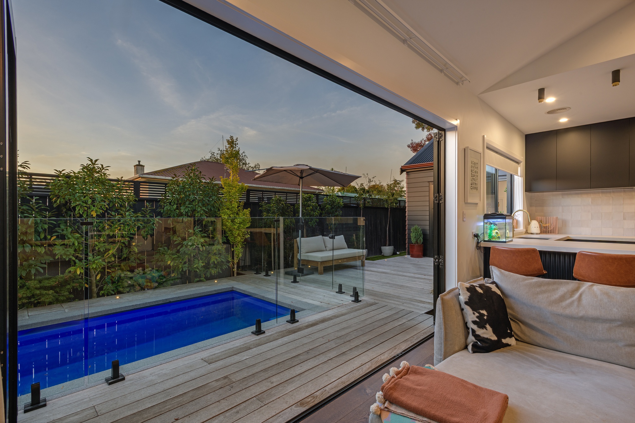 Contemporary, distinctive and high-end, yet executed with a clean minimalist flair, this central city home offers an exceptional living experience. Completed in 2022 by InHouse Construction - renowned for precision and attention to detail - this quality is evident at every turn. An open-plan living and dining area forms the heart of the home. A cathedral ceiling adds a sense of grandeur, while engineered timber flooring brings warmth, creating a space equally suited to intimate evenings or larger gatherings. Enjoy your morning coffee by the large picture window with its built-in bench seat, or gather around the breakfast bar in the striking black-and-white kitchen. Stone benchtops, a tiled splashback and sleek joinery combine to deliver timeless appeal. Positioned to capture the sun, bi-fold doors open seamlessly to a private timber deck and heated plunge pool-perfect for entertaining or unwinding. Thoughtfully designed feature lighting enhances the ambience, allowing you to enjoy this space well into the evening. The home offers three bedrooms, each with built-in drawers. The master suite enjoys direct access to the deck and pool, along with a beautifully appointed ensuite that truly sets this home apart. High-quality tiling and elegant fixtures continue through to the main bathroom and guest powder room, further showcasing the calibre of the build. A versatile, closable office nook off the hallway is a welcome addition for modern working life. Practical features include a carpeted garage with laundry facilities, ducted central heating, solar panels, and inbuilt ceiling speakers. Set in a sought-after hospital location, the property is zoned for Russell Street School and Palmerston North Boys' High School, with shops and supermarkets just minutes away. Privately positioned on a rear section, complete with an electric gate and artificial grass, this home offers security, privacy, and an easy-care 'lock and leave' lifestyle.