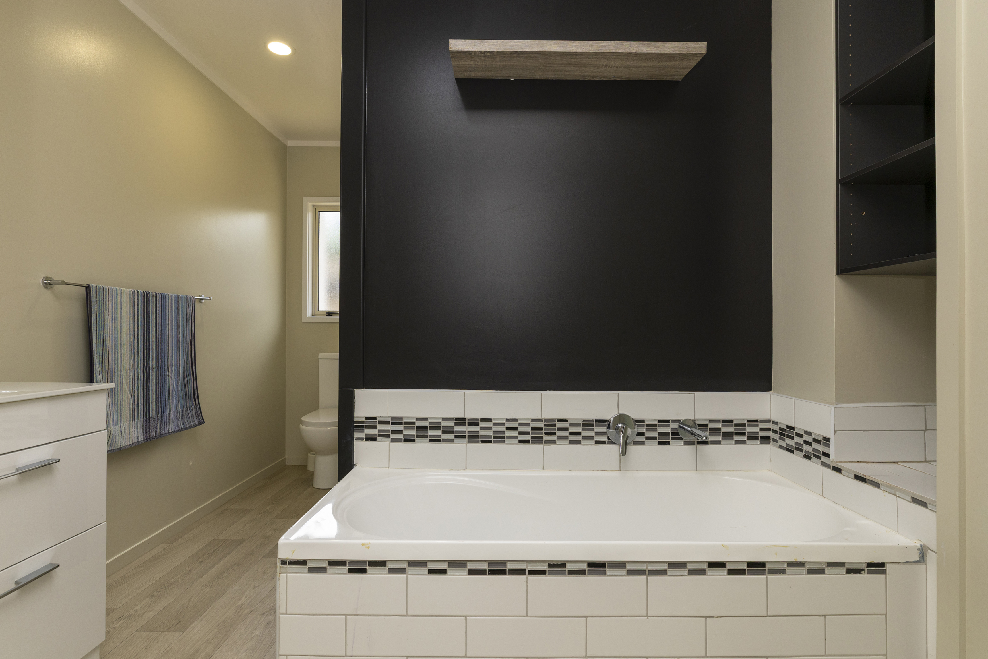 The upper unit boasts breathtaking views of the lake, marina, and town centre and includes two spacious bedrooms, both with a bathroom. Downstairs, there is a third large room currently dressed as a bedroom, right next to the laundry, with both internal and external access. A large double garage completes this unit. The attention to detail in the interior design is evident, with a well-appointed layout allowing for effortless living.