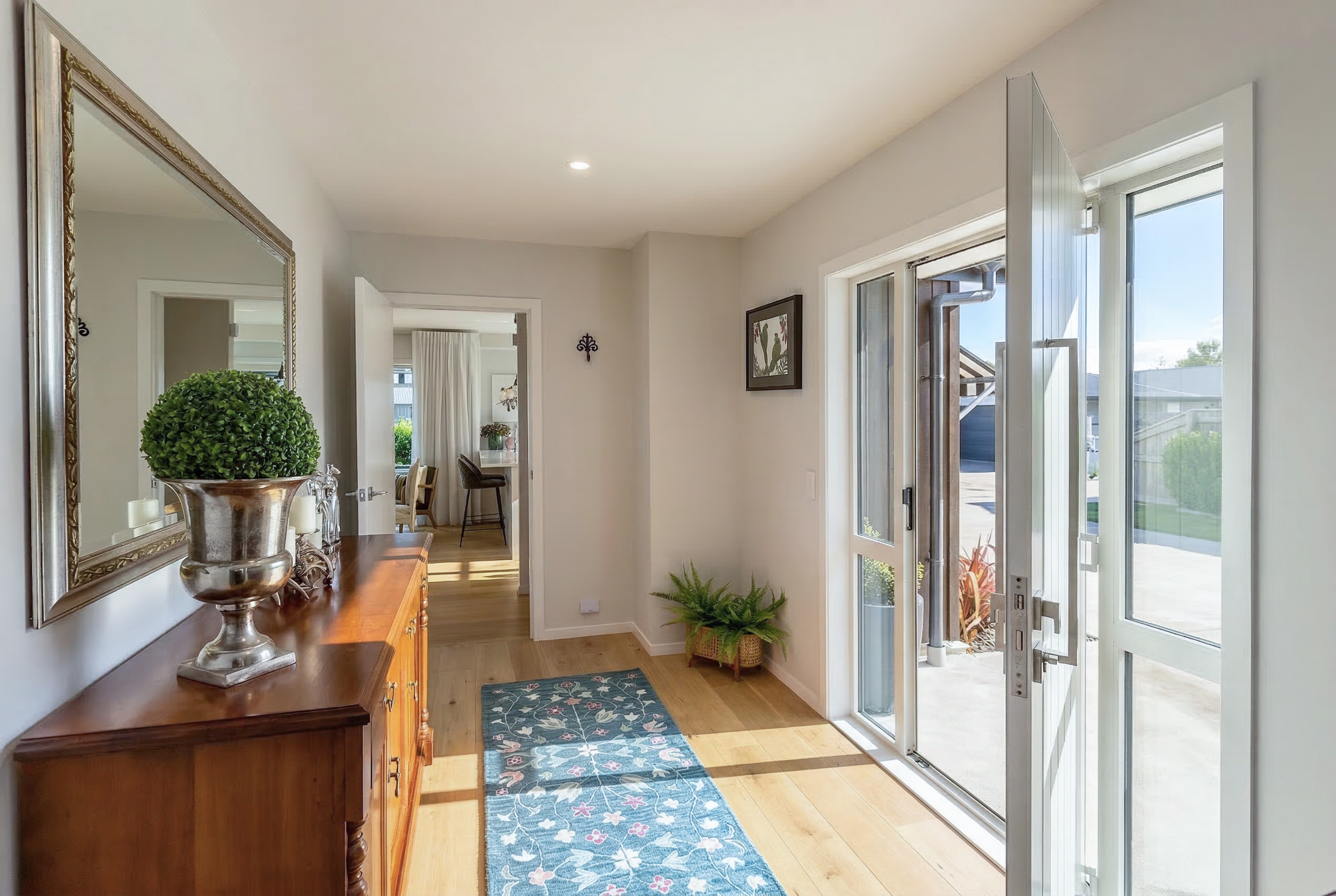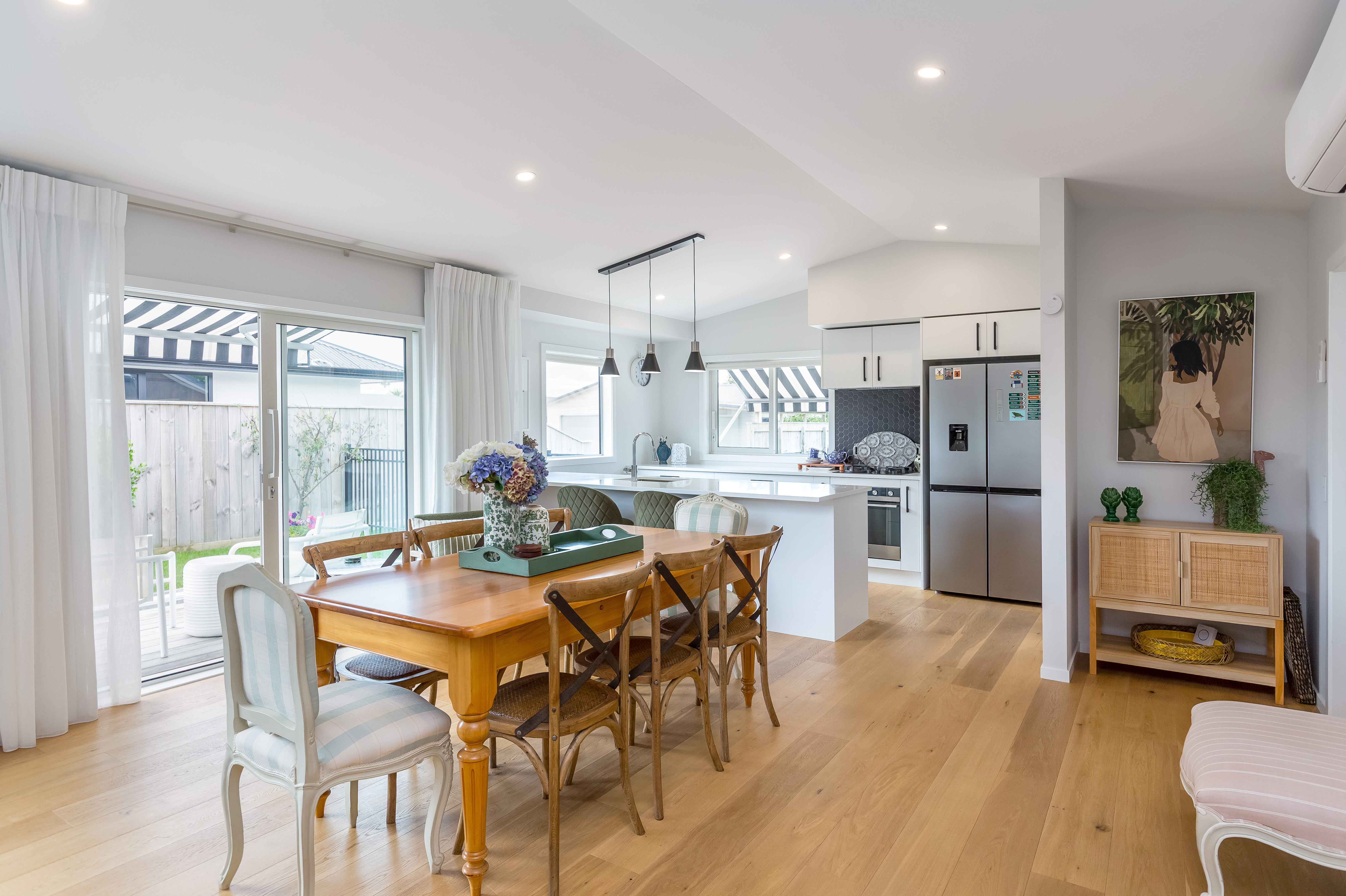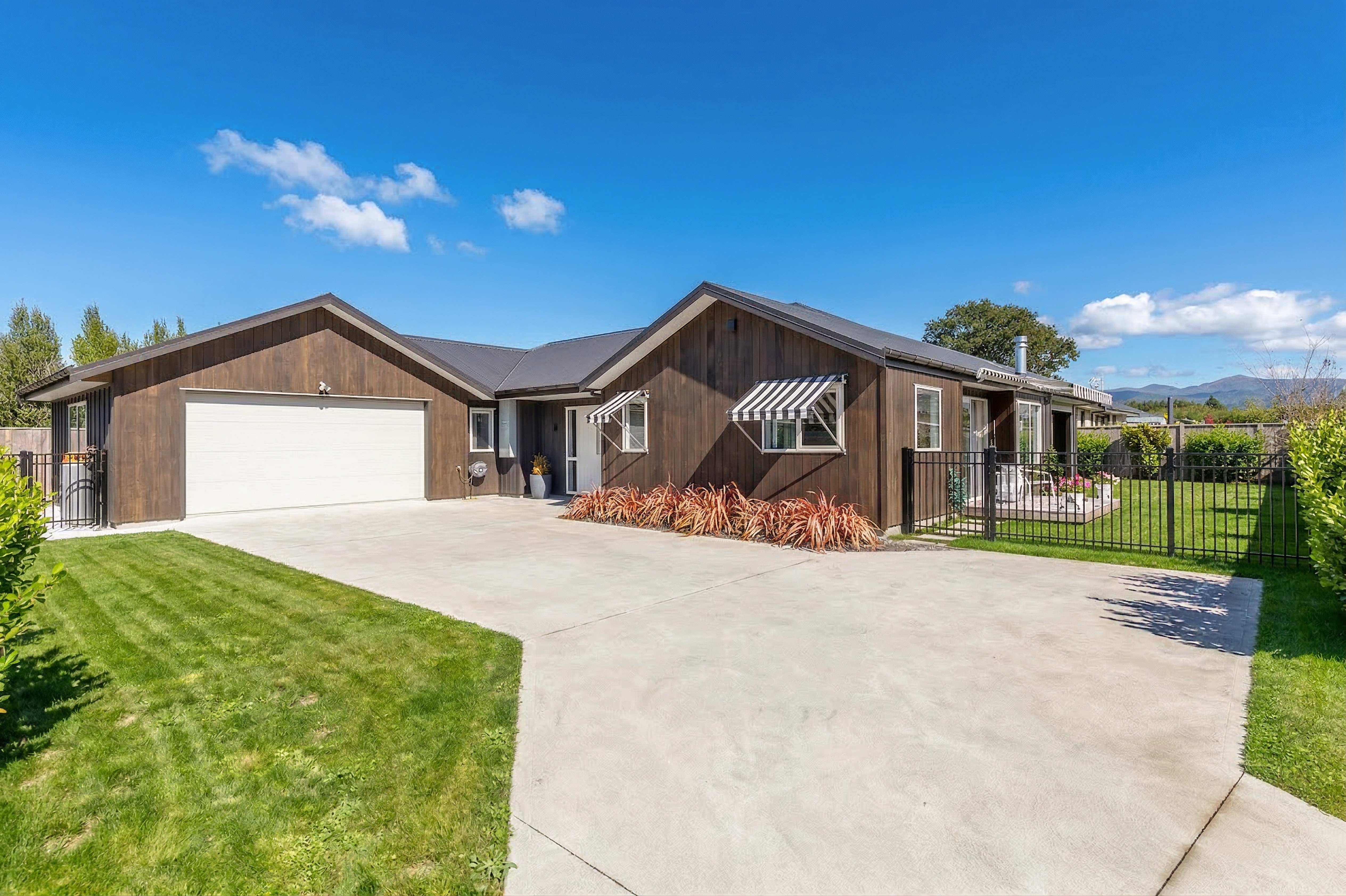 Completed in 2023 and located in close proximity to Greytown's vibrant village centre, this beautifully executed weatherboard and board and batten home delivers a considered blend of modern design and everyday comfort, with timeless details and quality finishes throughout. From the outset, the home makes a strong impression. Striped window awnings and a covered portico with sunshades create a distinctive facade, setting the tone for what lies within. Step inside and you're welcomed by a generous entry and wide hallways, enhancing the sense of space and flow. At the heart of the home, the kitchen is both functional and refined, featuring stone benchtops, a gas hob, built-in appliances, a dishwasher, and a well-appointed scullery that keeps everything neatly tucked away. The open-plan living area is warm and inviting, with oak flooring underfoot and chapel ceilings adding volume and character. A window seat provides a quiet place to unwind, while the wood burner and three heat pumps throughout the home ensure year-round comfort. Multiple sliding doors connect seamlessly to expansive kwila decking, creating effortless indoor-outdoor living. Whether you're entertaining or enjoying a quiet moment, there's always a spot to capture the sun or retreat into shade. The primary suite offers a private haven, complete with a tiled ensuite and direct outdoor access. A well-appointed family bathroom is complemented by a separate guest toilet, catering easily to both family and visitors.