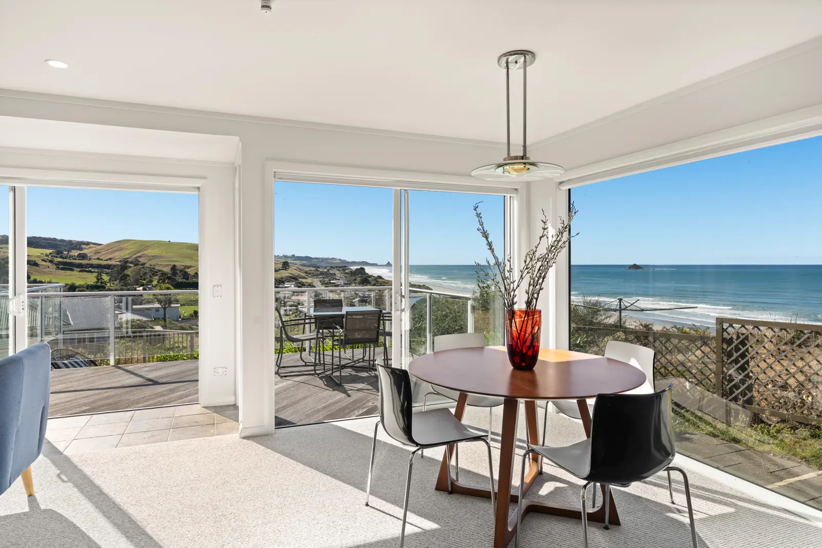 If your priority list in housing includes magnificent panoramic ocean views, directly north facing with all day sun, a sizeable home and one on a decent sized section, then 34 Bennett Road is a must-see. The established section provides that popular screening from the road and the meandering sealed drive down to the home provides plenty of off-street parking. The easy-care section at 1619m2 has mature oak, pohutukawa and silver birch trees, and large flat areas including a vegetable garden and plenty of space for the kids to play. Subdivision potential may exist but we will let you check that out for yourselves. The rear of the section rises up at the seaward side of the section to meet the floor level of the lounge, and visitors can either come up the internal stairwell from the garage or via either side of the home and arrive at the sliders on to the huge deck. The magnificent open plan kitchen-dining-living area is a sun trap and with the added benefits of double glazing, a Masport wood burner and new woollen carpets underfoot, this home is winter ready! The 180-degree views from Saddle Hill and down across Ocean View Beach are simply enthralling and an undeniable feature of this perfectly positioned home. Apart from the island out the window, the kitchen has an island also, plus a five burner gas hob, European dual oven and the Samsung fridge can even stay, but for those who like a view while baking, this is another plus for the family cook. The dining and living areas open to the expansive Kwila deck (which faces north and the ocean) via large sliders and this deck is also shared by the master bedroom. The master has an ensuite and is bathed in morning sun. This level also has another three bedrooms, one of which could easily be an office. The main bathroom is also handy to these three rooms. The lower level accommodates a fifth bedroom or second living area with bathroom and is indeed a great place for the teenager, visiting friends, a gym or larger home office. Other features of this large family home include LED lighting, heat pump, bathroom underfloor heating, new paintwork internally, high pressure Rheem hot water cylinder, large internal access garage with space for work bench/firewood, frequent bellbird, fantail, pigeon and tui visits, off-street parking for at least four vehicles, just a few minutes' walk to the beach via a public right of way, close by to schooling at Brighton, and buses direct to high schools in the city. This is one of Dunedin's standout seaside properties just 15 minutes to the city. The vendors are now Waimate-based and your opportunity to buy 34 Bennett Road is very much now! Please view at one of the scheduled open homes or by private appointment. The next move is yours...