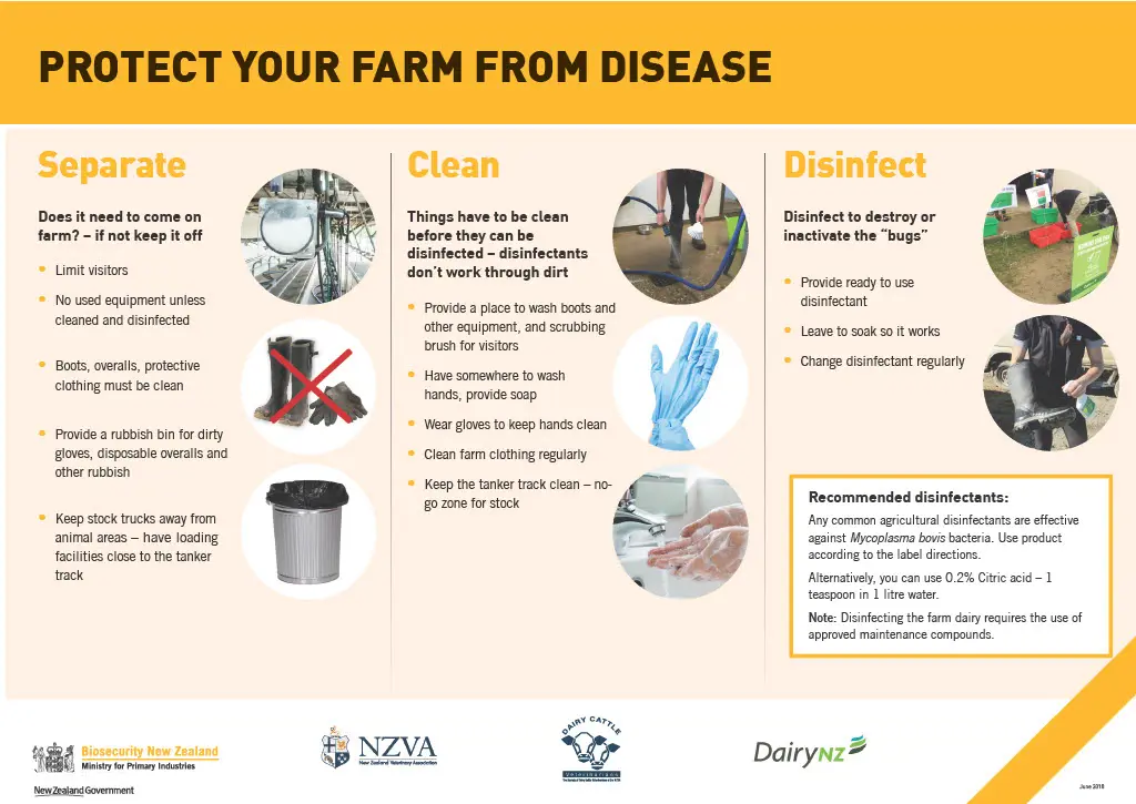 By limiting the movement of infected stock and disease transfer through contaminated vehicles, equipment and clothing we are not just reducing the risk of Mycoplasma bovis, but also the likes of Salmonella, BVD, Rotavirus, Pinkeye and Johne’s to name a few. It will also provide farmers some structure in the event that Foot and Mouth virus were to ever make it to these shores.
